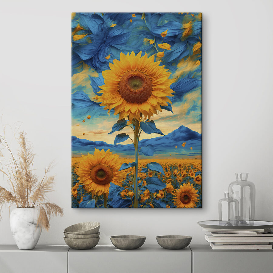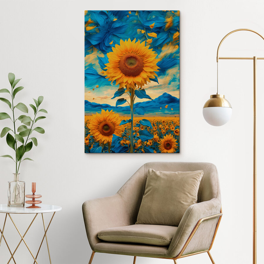 Rozjaśnij każde pomieszczenie dzięki temu wspaniałemu drukowi na płótnie przedstawiającemu słoneczniki wraz z żywymi niebieskimi i żółtymi liśćmi. Wyobraź sobie, że wkraczasz na pole skąpanych w słońcu kwiatów, a wszystko to otulone kocem orzeźwiających odcieni. Jest to rodzaj sztuki, która może sprawić, że ponury dzień poczuje się jak piknik w parku. Idealny do kuchni, przytulnych zakątków, a nawet pustej ściany, obok której ciągle przechodzisz. Kolory pojawiają się w sposób, który może wywołać uśmiech – to tak, jakby mieć kawałek słońca w domu. Każde spojrzenie jest jak ciepły uścisk, utrzymujący dobre wibracje przez cały rok. Nie tylko dekoruj, stwórz odrobinę szczęścia w domu!