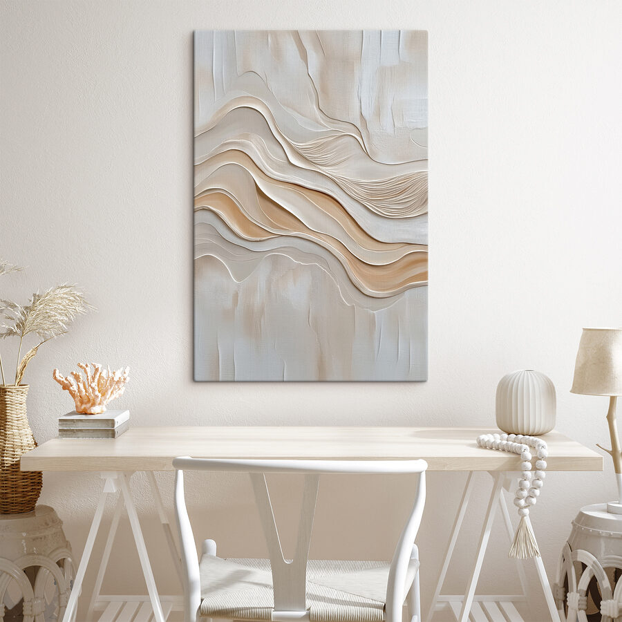 Odmień każde pomieszczenie dzięki tym oszałamiającym wydrukom na płótnie z delikatnymi białymi i brązowymi falistymi liniami, które tworzą spokojną i kojącą atmosferę. To jak przeniesienie kawałka spokojnej natury do wnętrza – idealne do przytulnych zakątków, w których czeka dobra książka. Wyobraź sobie wylegiwanie się z ciepłym napojem w ręku z tą grafiką, która rozbudza radość i wyobraźnię. Szepcze subtelną elegancją, a jednocześnie jest zabawnym początkiem rozmowy. Niezależnie od tego, czy jest to minimalistyczny pokój, czy tętniąca życiem przestrzeń, ten element bez wysiłku łączy wszystko razem, dodając odrobinę artystycznego stylu. Kto by tego nie chciał?
