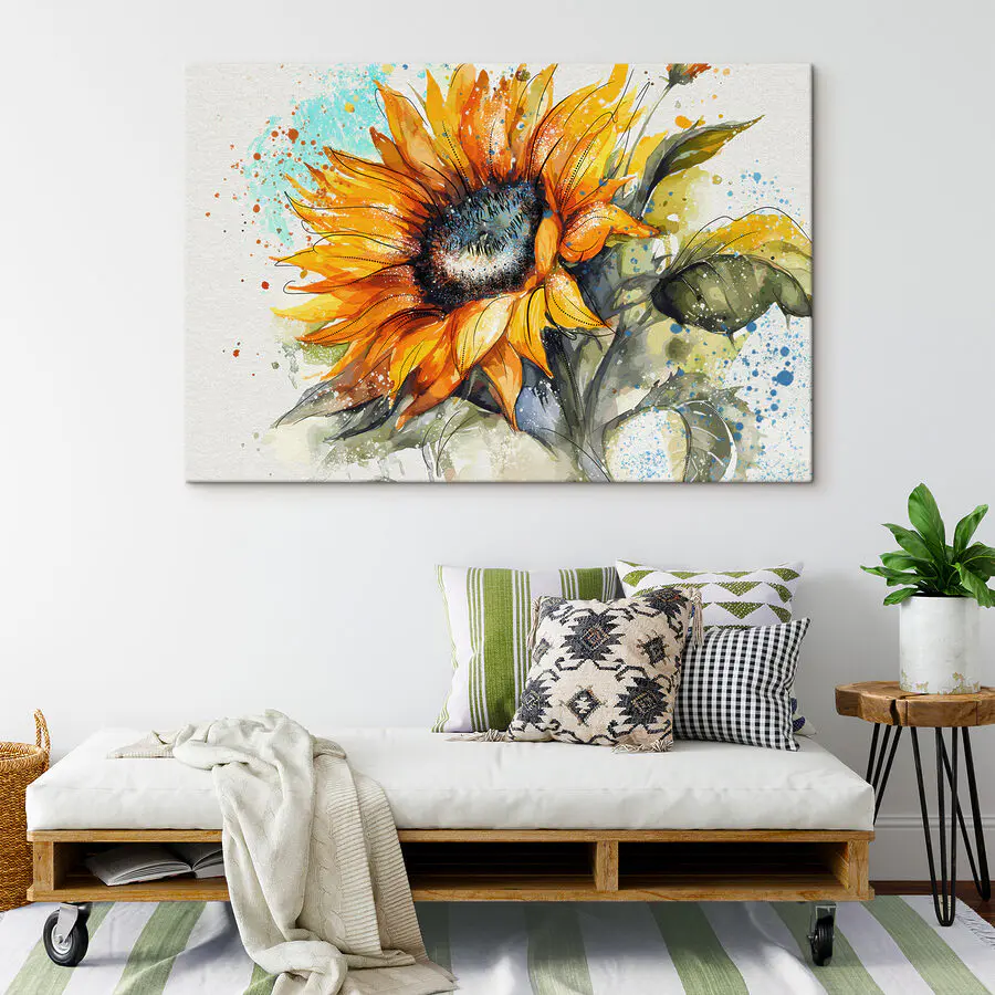Rozjaśnij każde pomieszczenie dzięki temu wesołemu płótnu z oszałamiającym słonecznikiem. Jego żywe kolory rozpryskują radość w całej przestrzeni, dzięki czemu można poczuć się jak latem przez cały rok. Wyobraź sobie, że budzisz się z tym pięknem – to jak radosny uśmiech natury bezpośrednio na ścianie! Idealny do przytulnych zakątków lub do ożywienia nudnego kąta, ten kawałek zaprasza ciepło i pozytywne nastawienie. Jest to również fantastyczny początek rozmowy; odwiedzający nie mogą pomóc, ale czują się podniesieni na duchu przez jego urok. Kto by pomyślał, że kwiat może mieć taką osobowość? Idealny dla każdego, kto uwielbia dodawać odrobinę natury do wnętrz!