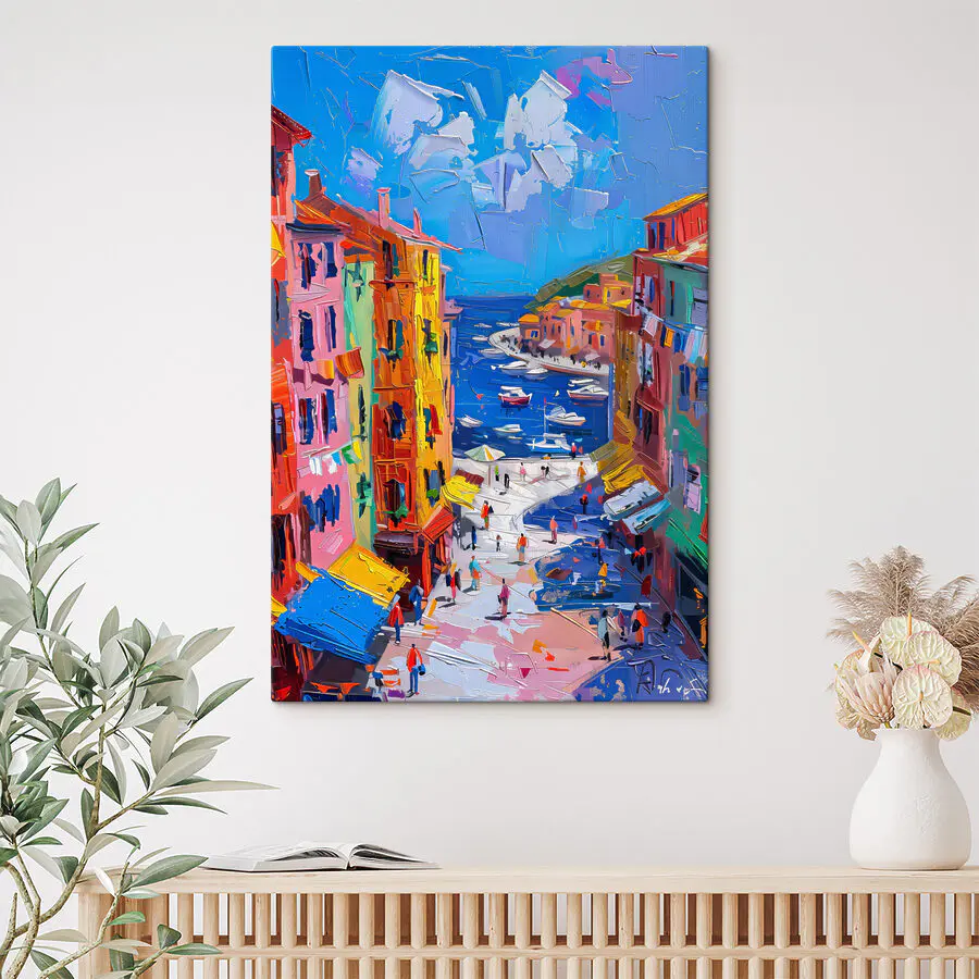 Wyobraź sobie – budzisz się, wchodzisz do swojego salonu i bum! Patrzysz na to tętniące życiem dzieło sztuki – obraz na płótnie s39627. Te elektryczne kolory, tętniąca życiem scena – czy jest coś lepszego, aby podnieść na duchu? Za każdym razem, gdy na nią spojrzysz, poczujesz się jak na mini wakacjach. Uderzenia są tak żywe, że prawie słychać rozmowy z ulic, rozbijające się fale… nawet zapach morskiej bryzy. W zasadzie przenosi całą atmosferę tego miejsca prosto do twojej przestrzeni – kto potrzebuje biletów lotniczych, kiedy masz to na ścianie?