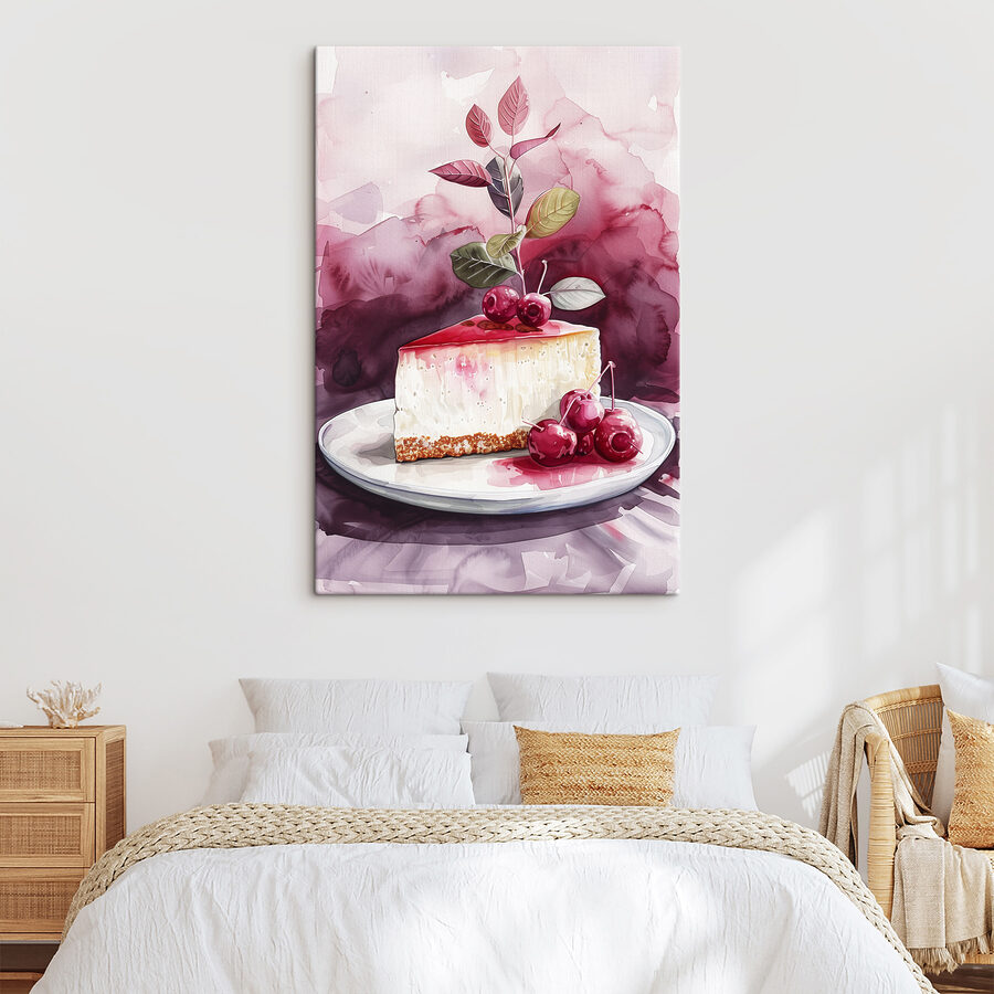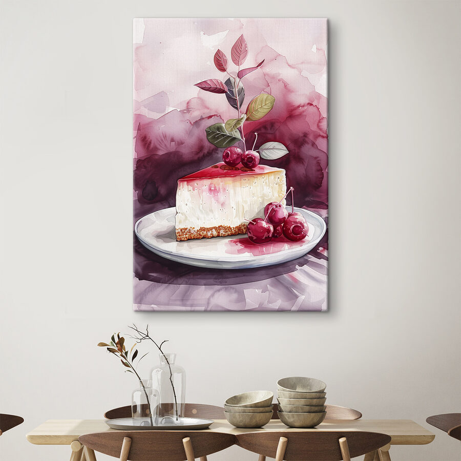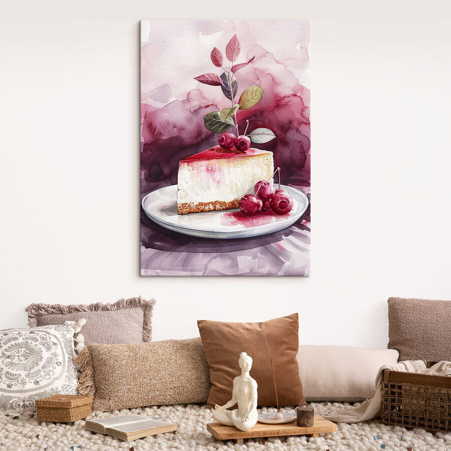 Masz ochotę na słodycze? “Obraz s39700” to idealny obraz, który doda odrobinę marzeń i pyszności do Twojej przestrzeni! Ta urocza grafika przedstawia przepyszny kawałek sernika z błyszczącymi wiśniami – wygląda prawie tak dobrze, że można go zjeść… ale może nie próbuj tego!