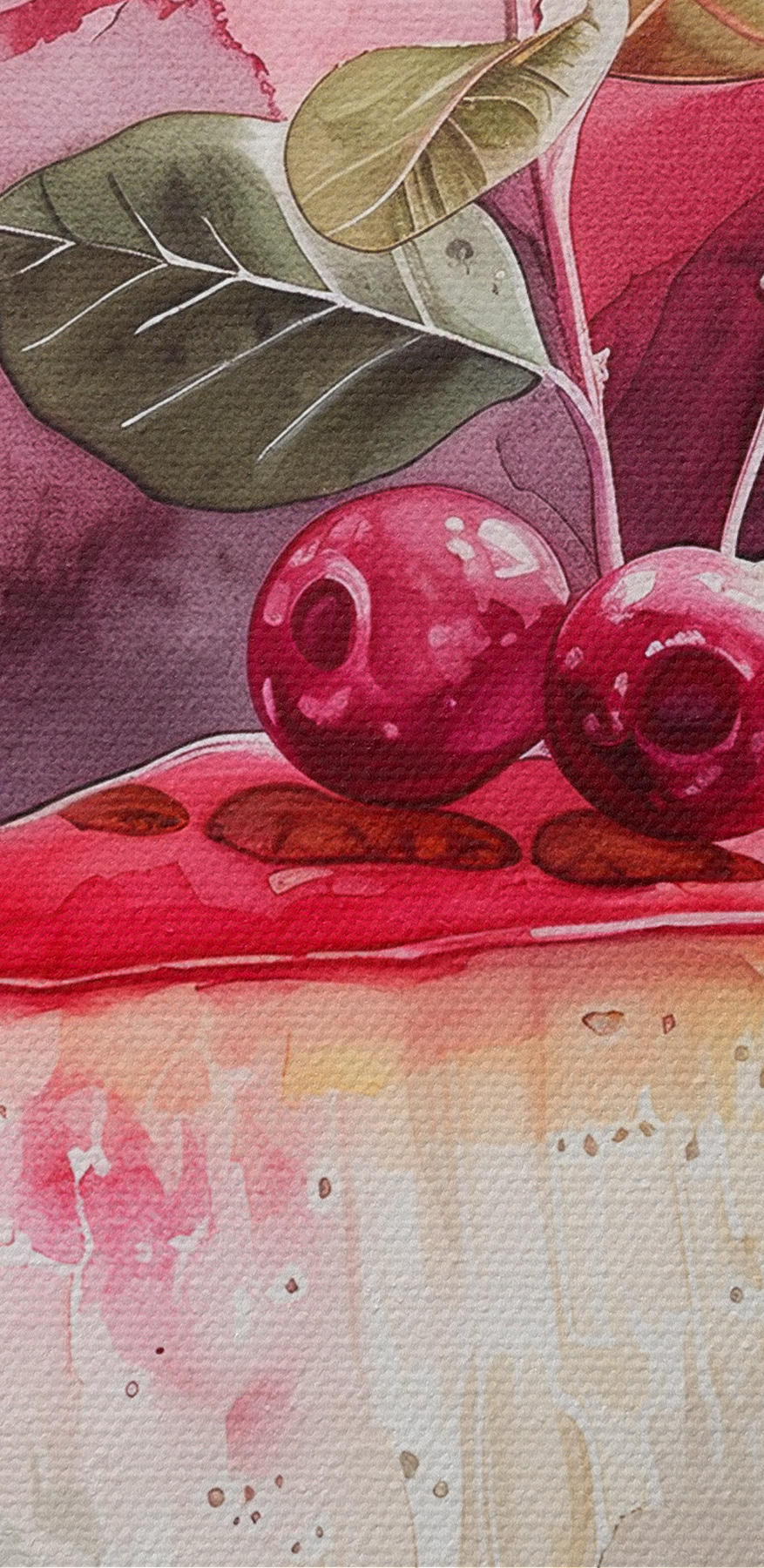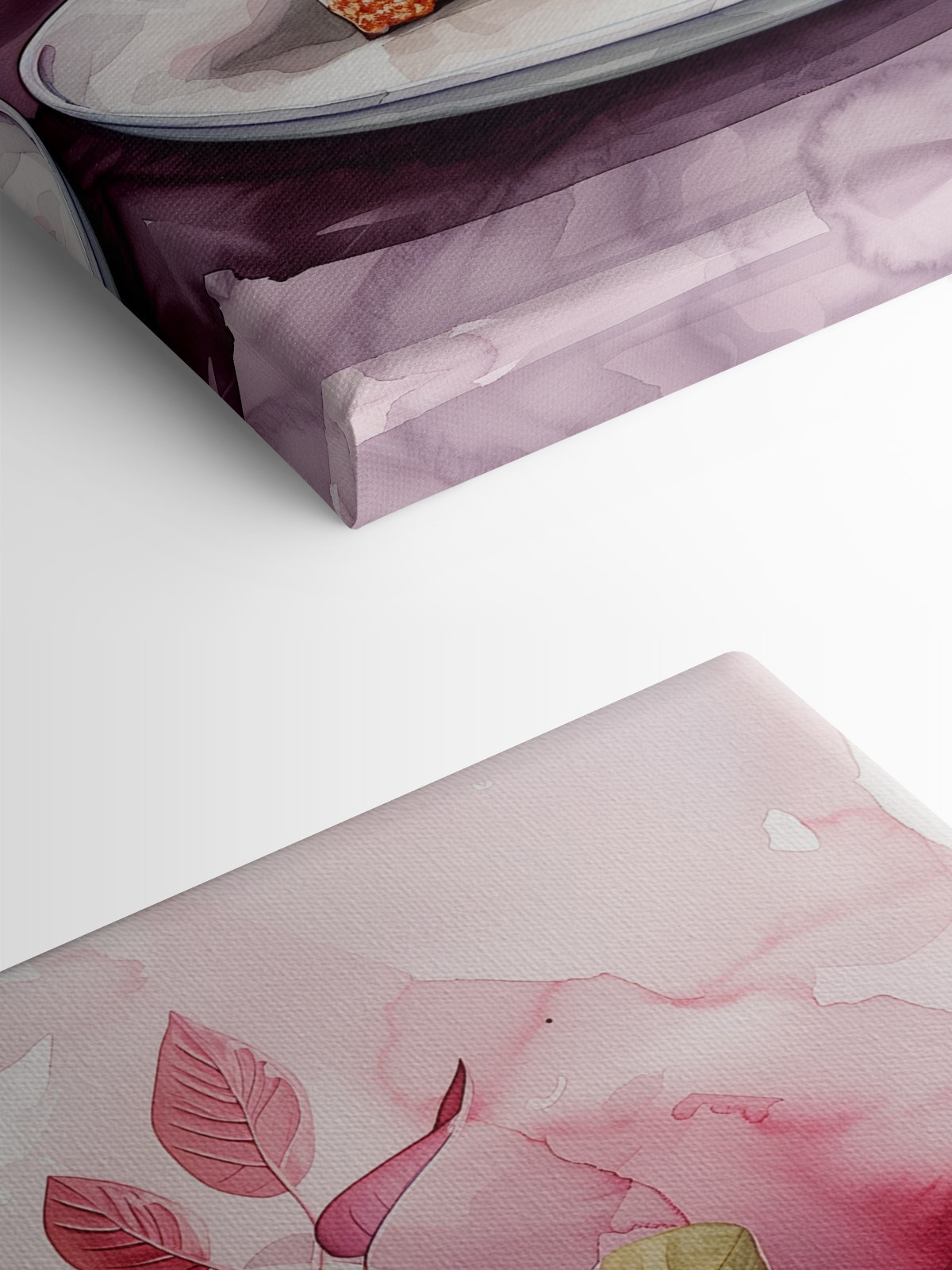 Akwarelowe tło wiruje w delikatnych odcieniach różu i fioletu, tworząc przytulną i ciepłą atmosferę. Wyobraź sobie, że wieszasz ten obraz w swojej kuchni lub jadalni – z pewnością wywoła on kilka miłych rozmów. Wyobraź to sobie: przyjaciele zebrani wokół, być może wspominający ulubione desery, których próbowali lub przepisy, które stworzyli. Ten wydruk nie tylko wisi na ścianie; wnosi element ciepła i domowej atmosfery.