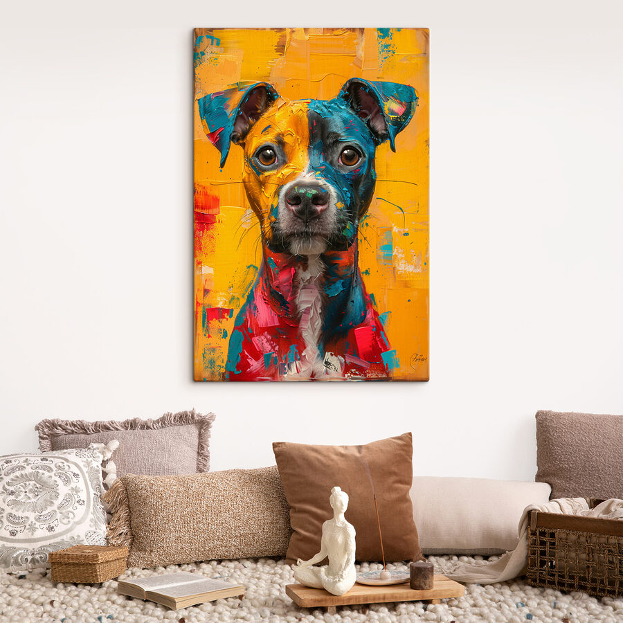 Czyż ten obraz nie tryska życiem? “Obraz s39722” jest jak plusk szczęścia na ścianie. Wyobraź sobie, że wchodzisz do swojego salonu po długim dniu i bum! Oto on – żywy, dziwaczny pies z uduchowionymi oczami, wpatrujący się prosto w ciebie. To jak mieszanka sztuki i zabawy, i w jakiś sposób wydaje się, że pies podziela twój nastrój.