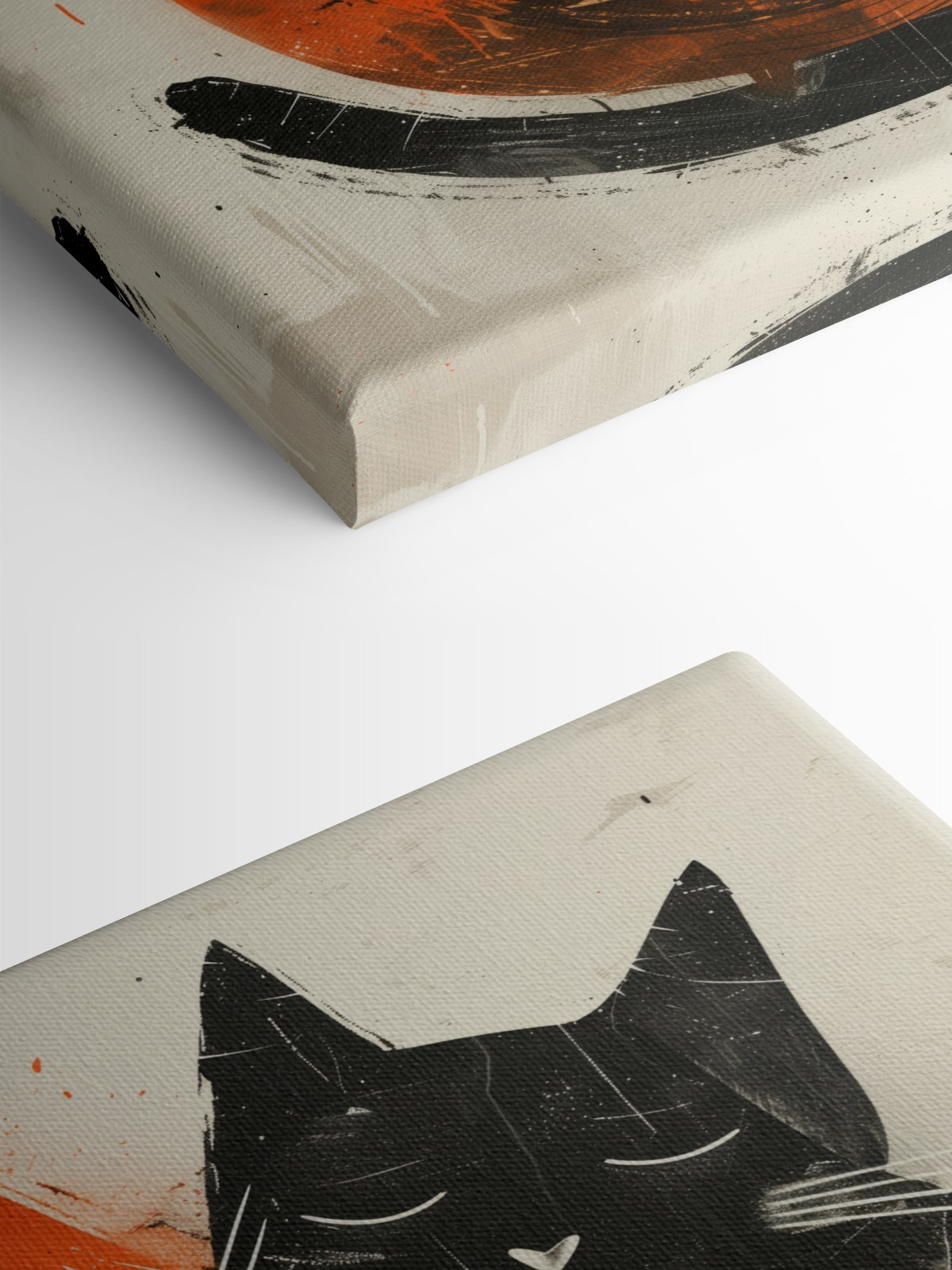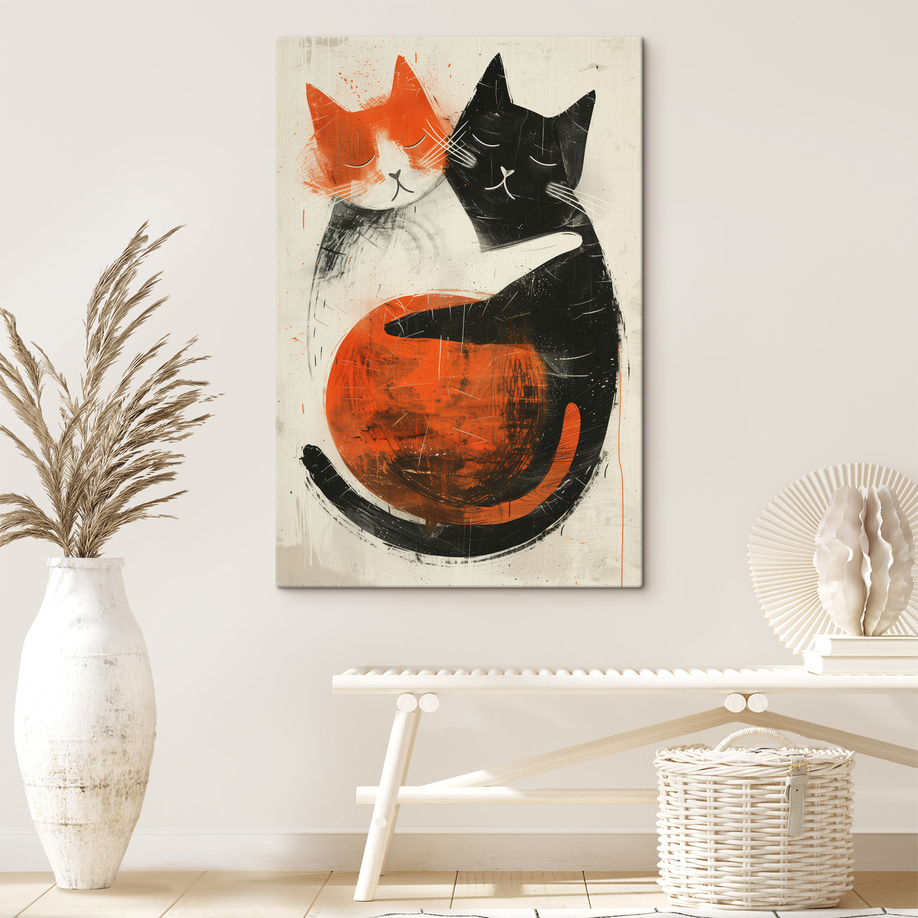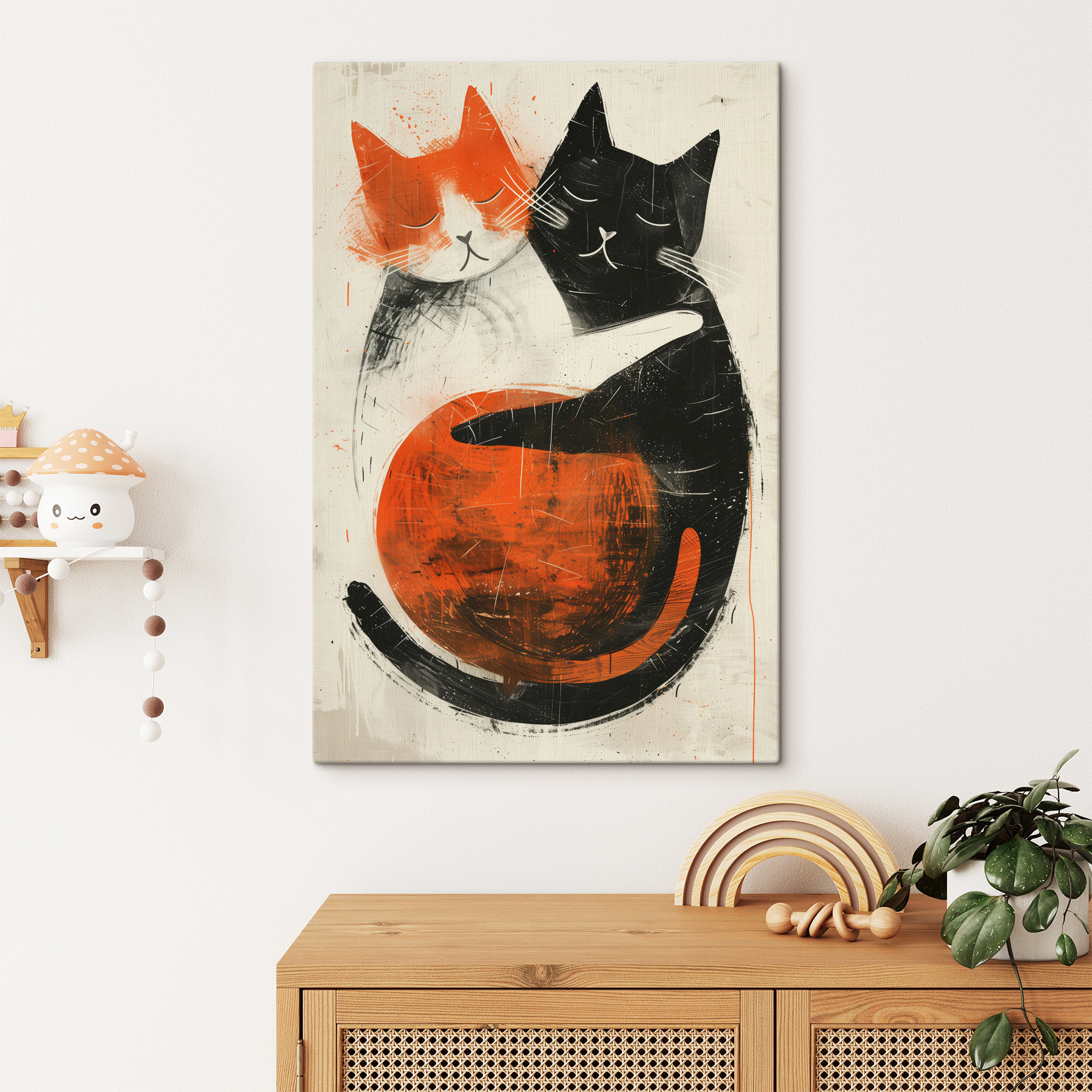 Ta grafika pasuje wszędzie, od salonów po kąciki do spania. Ma fajny, niemal retro styl, łącząc żywe pomarańcze i głęboką czerń, tworząc ciepły, przytulny klimat. Wyobraź sobie, że wracasz do domu po długim dniu – widok tych uroczych twarzy z pewnością rozładuje stres. To jak mini uścisk na płótnie! Łatwy do pokochania i jeszcze łatwiejszy do zintegrowania z istniejącym wystrojem, przemawia zarówno do miłośników sztuki, jak i entuzjastów kotów. Daj więc swoim ścianom coś, co sprawi, że się uśmiechniesz!