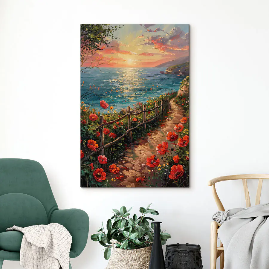 Wyobraź sobie spokojną ścieżkę wijącą się wzdłuż brzegu wody, otoczoną gobelinem kwitnących kwiatów. Ten wydruk na płótnie oddaje moment, w którym natura zdaje się szeptać sekrety spokoju i piękna. Gdy słońce schodzi poniżej horyzontu, odcienie pomarańczy i różu tańczą po niebie, zachęcając do poczucia spokoju.