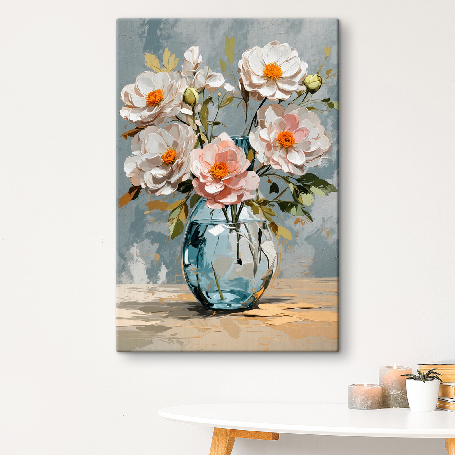 Rozjaśnij każdą przestrzeń dzięki temu uroczemu drukowi na płótnie przedstawiającemu wazon pełen pięknych kwiatów. Miękkie kolory i delikatne pociągnięcia pędzla zachęcają do zatrzymania się i docenienia piękna natury, prawie jak delikatne przypomnienie, aby zatrzymać się i powąchać róże – gdyby tylko rzeczywiście pachniały! Wyobraź sobie, że wisi nad przytulnym kącikiem do czytania, a może w kuchni, gdzie może inspirować do kulinarnych przygód. Każde spojrzenie przynosi odrobinę ciepła i radości, idealne do stworzenia radosnej atmosfery. Kto nie chciałby mieć wokół siebie tej radosnej feerii barw? To tak, jakby mieć odrobinę świeżego powietrza w swoim wnętrzu!