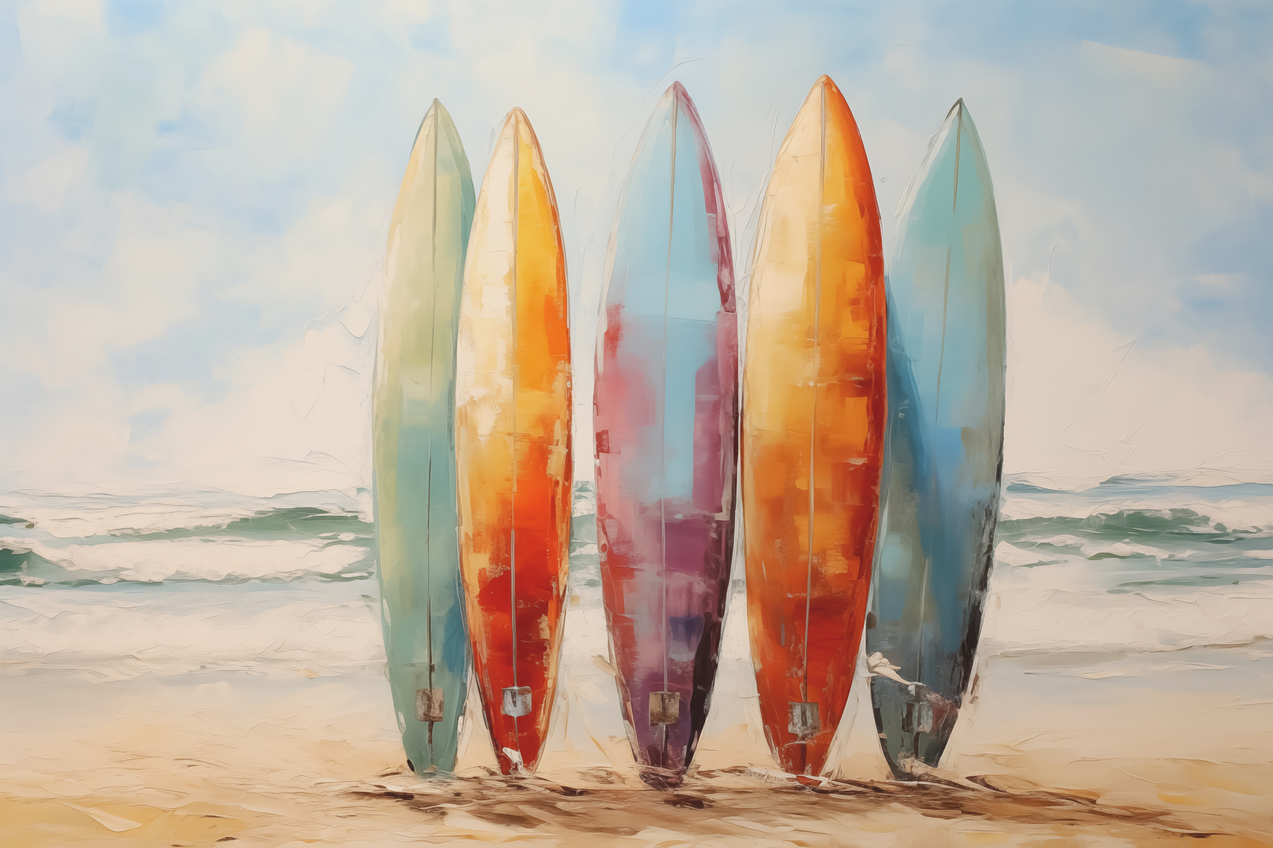 Przekształć dowolny pokój w plażowy raj dzięki temu żywemu płótnu przedstawiającemu deski surfingowe ustawione na brzegu. To jak ciepły uścisk w letni dzień, wraz z delikatnymi falami szepczącymi w tle. Wyobraź sobie popijanie chłodnego drinka podczas wspominania słonecznych wakacji, a nawet planowanie kolejnej wyprawy surfingowej – trzymamy kciuki za zabójcze fale, prawda? Zabawne kolory sprawiają, że w pomieszczeniu panuje radosna atmosfera. Zawieś go w salonie lub nawet w przytulnym zakątku i pozwól mu pobudzić rozmowy i marzenia. Któż nie kocha małej ucieczki?