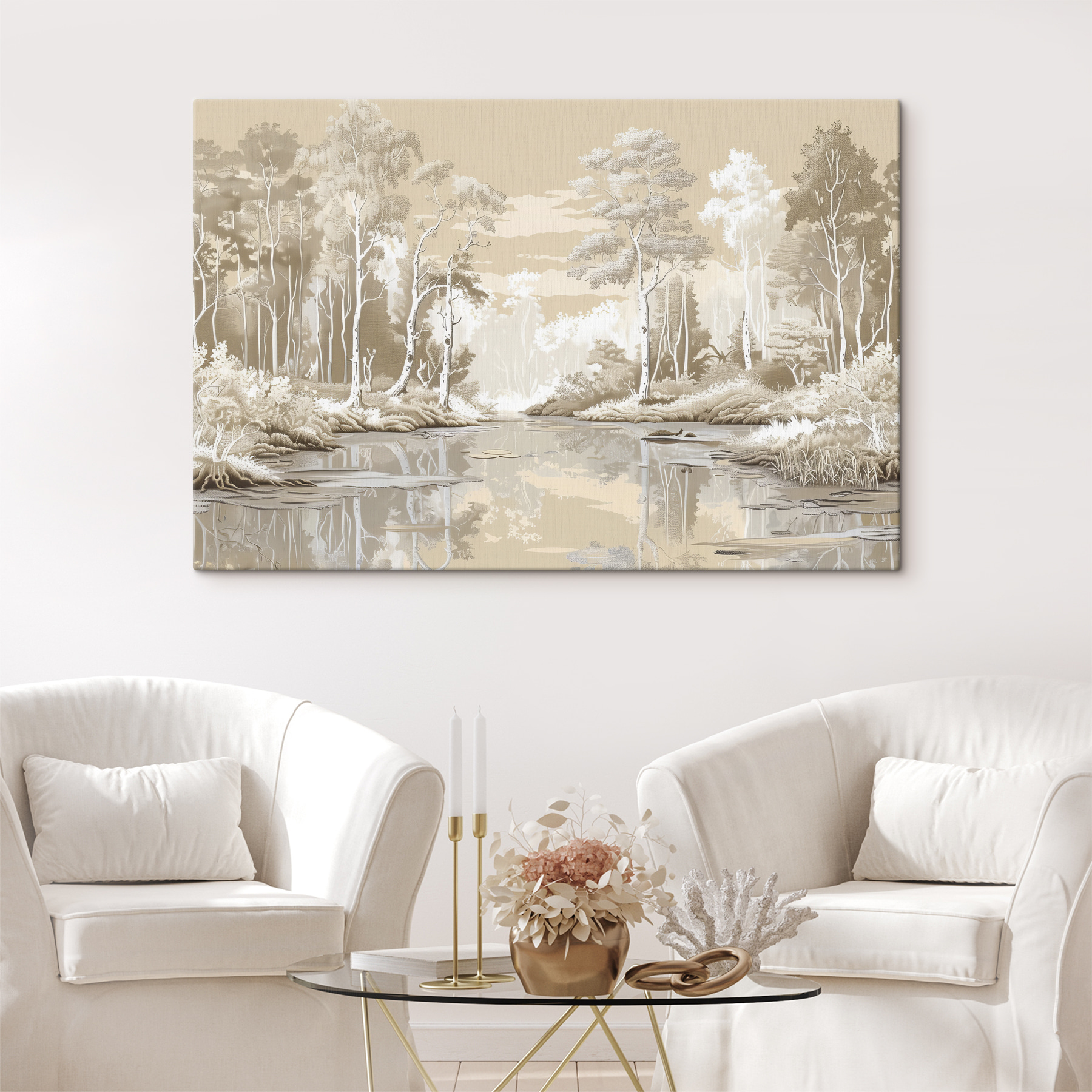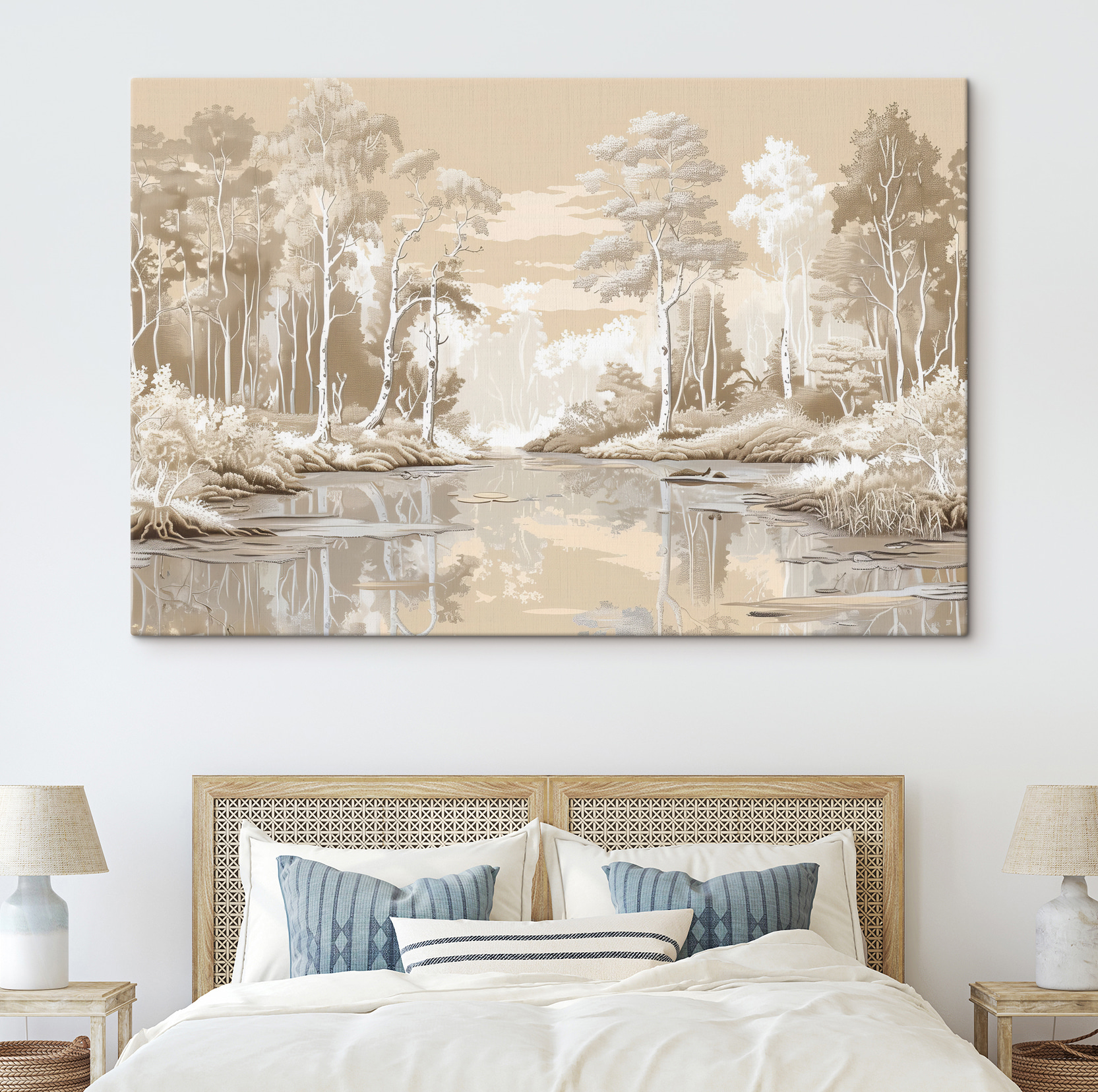 Wyobraź sobie, że wchodzisz do oazy spokoju za każdym razem, gdy wchodzisz do swojego pokoju. Ten wydruk na płótnie przedstawiający spokojną rzekę otoczoną bujnymi drzewami i delikatnymi roślinami wprowadza spokój natury do wnętrza. Delikatne odbicie w wodzie sprawia, że czujesz się jak w raju na swojej ścianie. Idealny do przytulnego kącika do czytania lub uspokajającej sypialni, przypomina o zwolnieniu tempa i oddychaniu. Kto nie chciałby marzyć nad rzeką? Wystarczy powiesić go, zapalić świecę i rozpocząć relaks. Otocz się urokiem natury i pozwól swoim zmartwieniom odpłynąć.