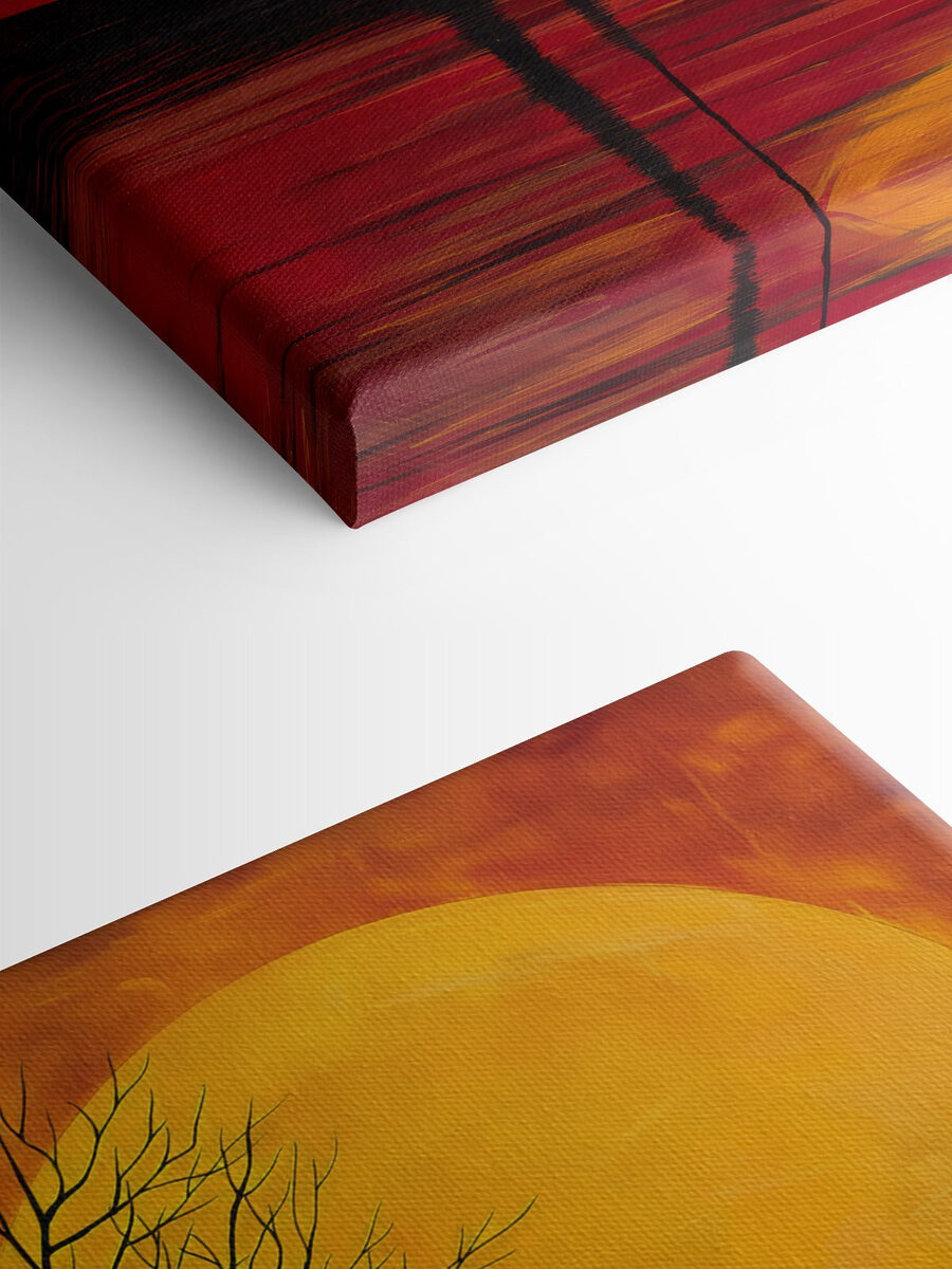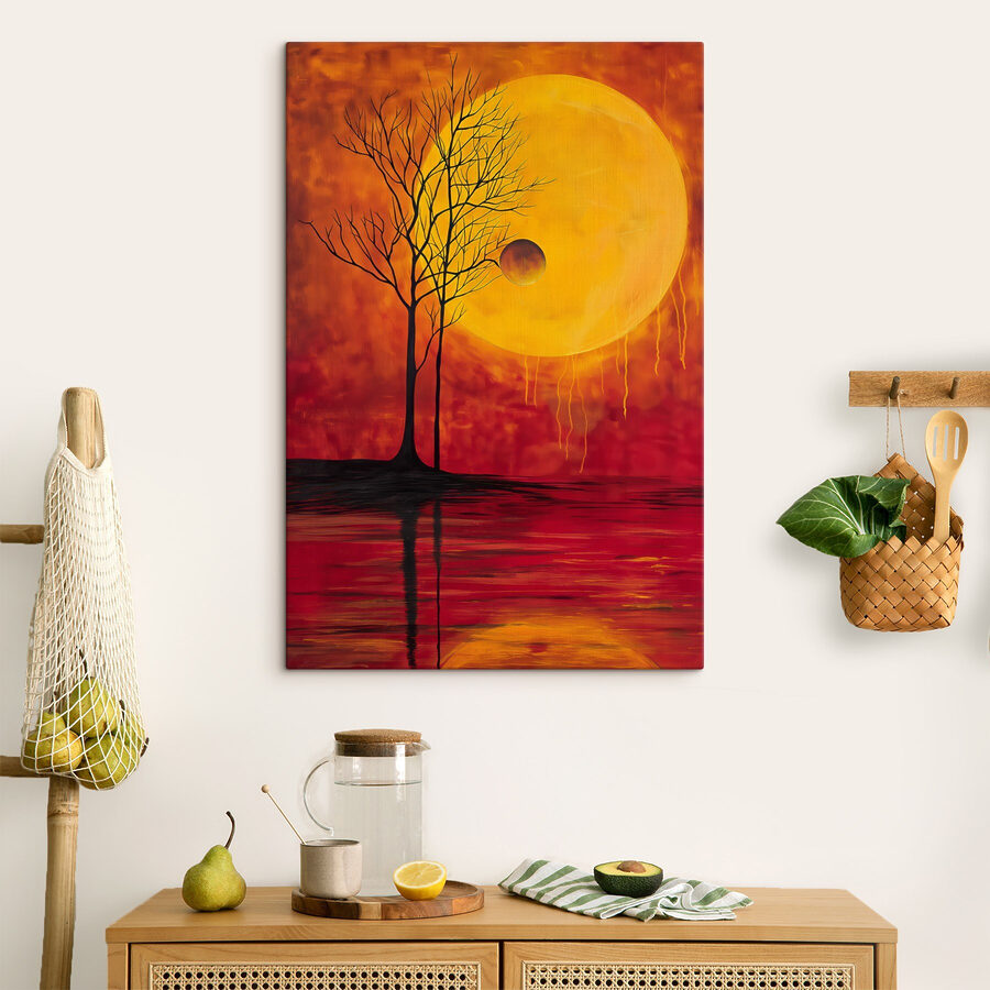 Odmień każdą przestrzeń dzięki temu czarującemu obrazowi na płótnie przedstawiającemu drzewo na tle księżyca. Wyobraź sobie, że popijasz ulubioną herbatę, wpatrujesz się w tę urzekającą grafikę i czujesz, jak ogarnia Cię fala spokoju. Bogate kolory tańczą razem, przywołując ten magiczny moment, gdy dzień zamienia się w noc. Idealnie nadaje się do ożywienia przytulnego kącika lub nadania wyrazu w salonie. Ponadto dodaje odrobinę piękna natury bez konieczności posiadania zielonego kciuka. Niezależnie od tego, czy wywołuje głębokie myśli, czy po prostu daje ciepłe, rozmyte uczucie, z pewnością będzie początkiem rozmowy. Idealny dla każdego, kto kocha unikalny wystrój z niespodzianką!