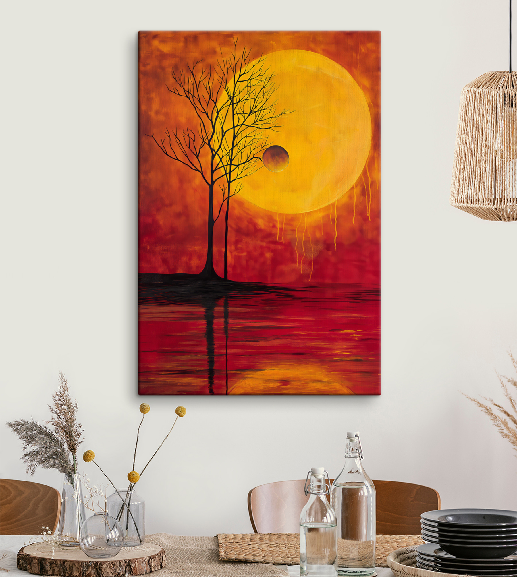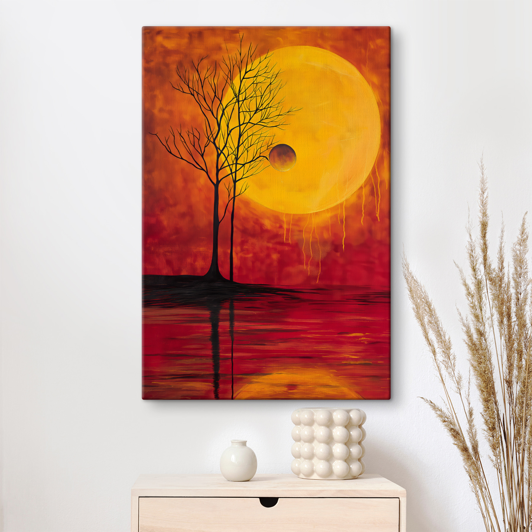 Odmień każdą przestrzeń dzięki temu czarującemu obrazowi na płótnie przedstawiającemu drzewo na tle księżyca. Wyobraź sobie, że popijasz ulubioną herbatę, wpatrujesz się w tę urzekającą grafikę i czujesz, jak ogarnia Cię fala spokoju. Bogate kolory tańczą razem, przywołując ten magiczny moment, gdy dzień zamienia się w noc. Idealnie nadaje się do ożywienia przytulnego kącika lub nadania wyrazu w salonie. Ponadto dodaje odrobinę piękna natury bez konieczności posiadania zielonego kciuka. Niezależnie od tego, czy wywołuje głębokie myśli, czy po prostu daje ciepłe, rozmyte uczucie, z pewnością będzie początkiem rozmowy. Idealny dla każdego, kto kocha unikalny wystrój z niespodzianką!