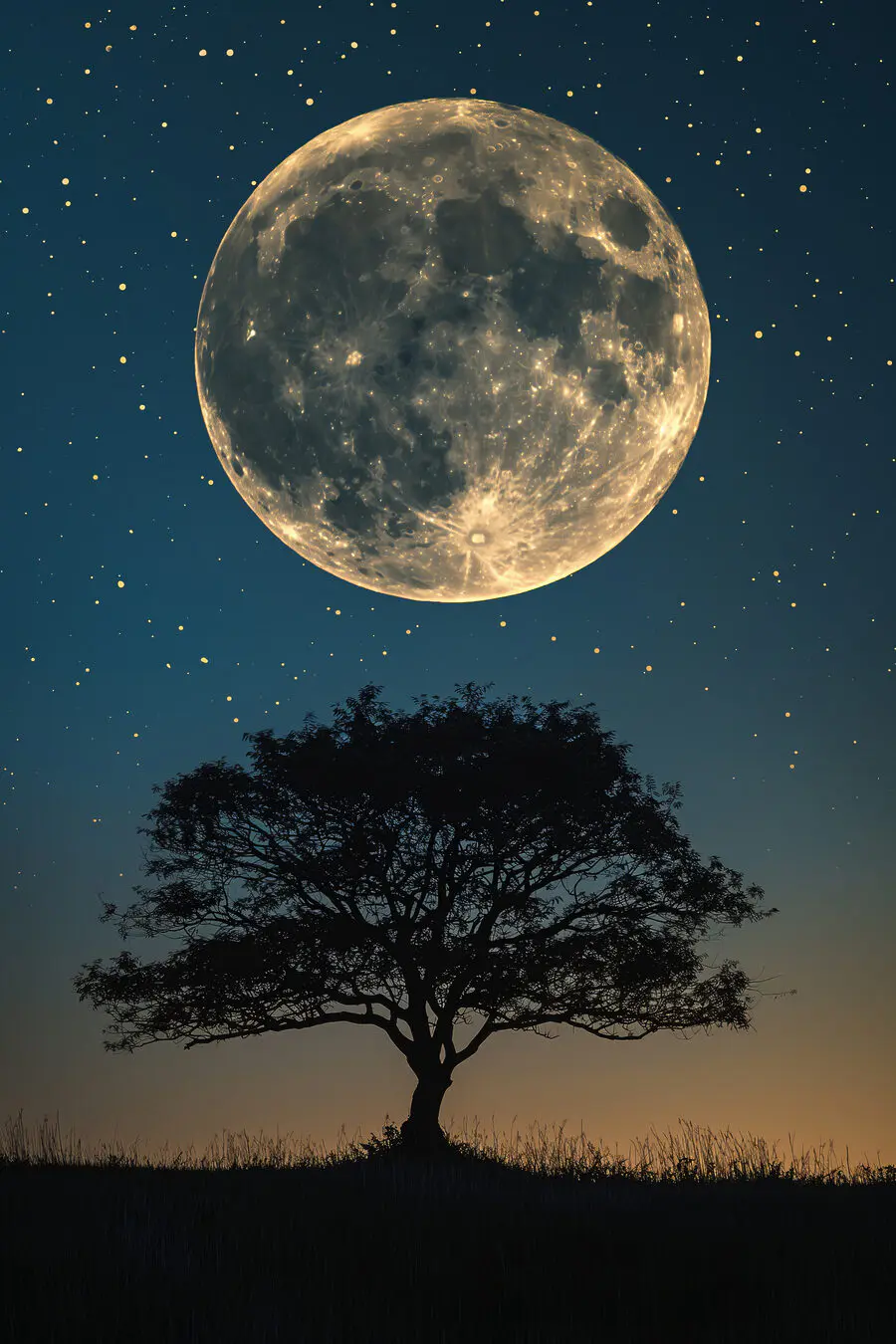 Wyobraź sobie spokojny wieczór, w którym majestatyczne drzewo stoi cicho pod ogromnym księżycem. Ten wydruk na płótnie, przedstawiający delikatny taniec natury i niebiańskie cuda, wnosi odrobinę spokoju do Twojej przestrzeni życiowej. Wyobraź sobie przytulne noce spędzone na wpatrywaniu się w tę grafikę, czując delikatny spokój ogarniający cię jak ciepły uścisk. Jest to idealne miejsce do prowadzenia rozmów lub po prostu zagubienia się w myślach. Niezależnie od tego, czy znajduje się w salonie, czy w spokojnym zakątku, bez wysiłku tchnie życie i duszę w każdy zakątek. Odrobina magii, która szepcze historie, zapraszając do spokojnych snów i rozmyślań o gwieździstych oczach.