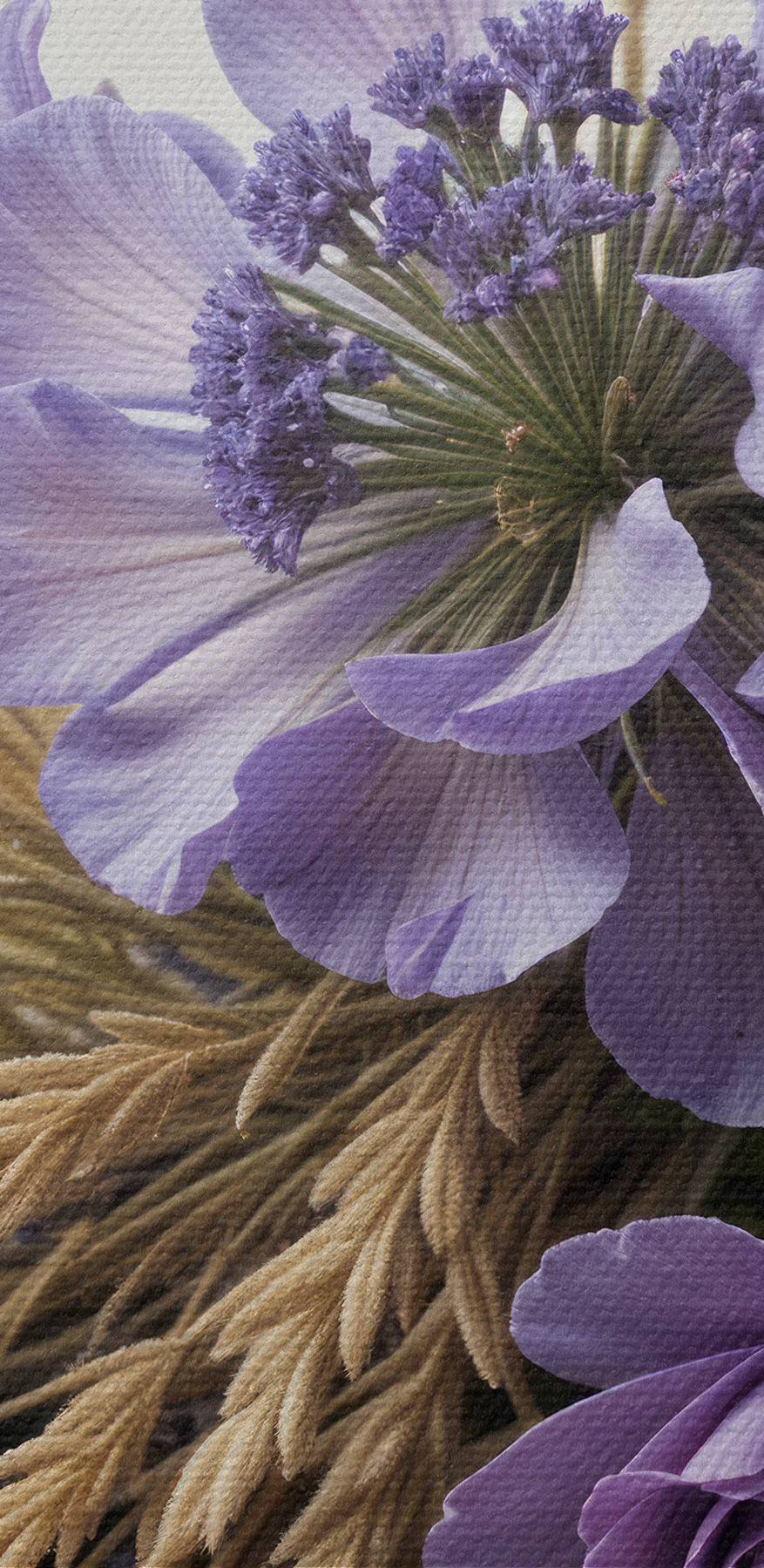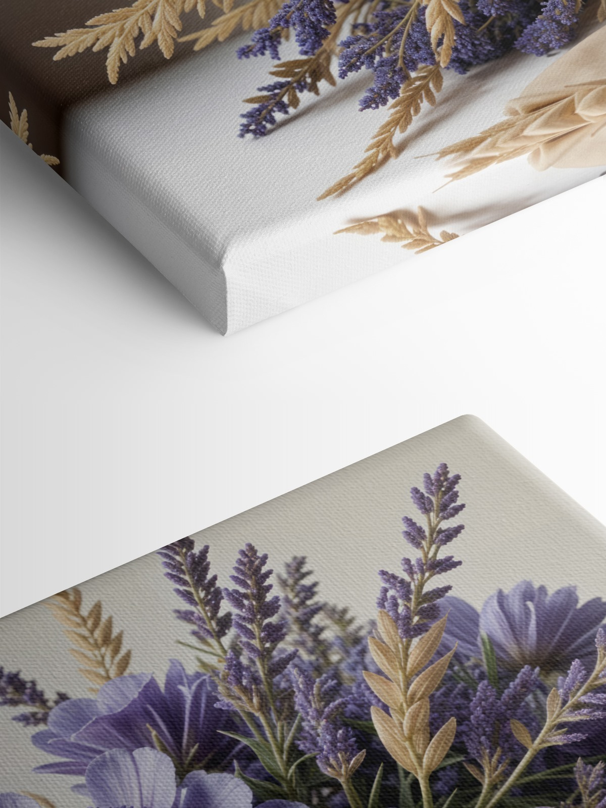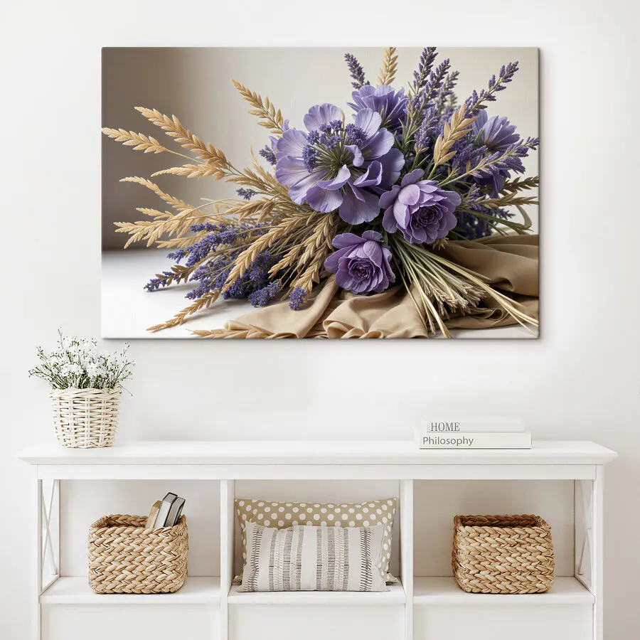 Rozjaśnij każdą ścianę tym uroczym wydrukiem na płótnie przedstawiającym zachwycający bukiet fioletowych kwiatów i złotej pszenicy. To tak, jakbyś miał mini ogród w swoim salonie, bez konewki. Wyobraź sobie przytulne wieczory, popijając herbatę i czując ten ciepły klimat dookoła. To idealne rozwiązanie na pustą ścianę, która od jakiegoś czasu przyciąga wzrok. Miękkie odcienie i płynne tekstury zachęcają do poczucia spokoju i wyciszenia – kto by tego nie chciał? Ponadto jest to fantastyczny początek rozmowy. Wystarczy wyobrazić sobie znajomych zachwycających się tym pięknym wybuchem natury.