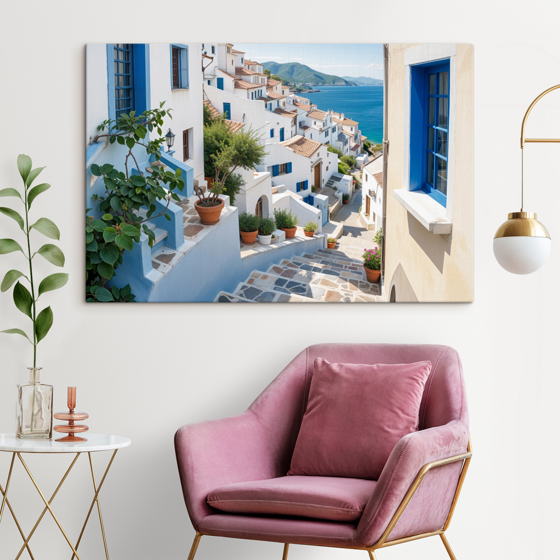 Wejdź do czarującego świata dzięki temu drukowi na płótnie przedstawiającemu malownicze schody wijące się przez urocze miasteczko. Każdy zakręt przyciąga wzrok, zachęcając do marzeń o słonecznych popołudniach i szeptanych rozmowach przy kawie. Niebieskie akcenty mogą rozjaśnić nawet najbardziej ponury poniedziałek. Wyobraź sobie ten przedmiot w przytulnym zakątku, wywołujący rozmowy o podróżach i przygodach – kto nie chciałby porozmawiać o miejscu, które wydaje się być sekretnym schronieniem? To jak przyniesienie kawałka słońca prosto do domu, idealne dla tych, którzy kochają odrobinę wędrówki w swoim wystroju. Każde spojrzenie przypomina o pięknie czekającym tuż za naszymi drzwiami.