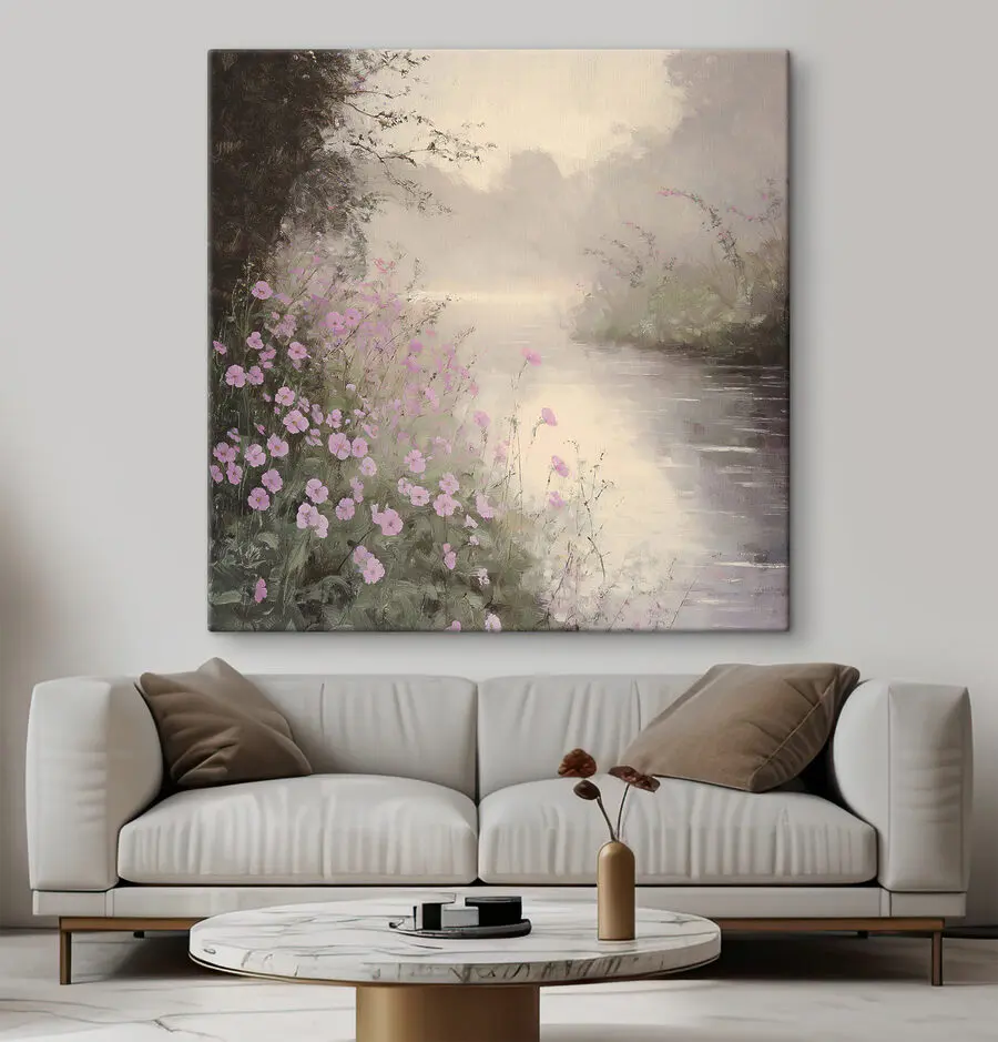 Odmień swoją przestrzeń dzięki temu uroczemu drukowi na płótnie przedstawiającemu spokojną rzekę ozdobioną delikatnymi fioletowymi kwiatami. Wyobraź sobie, że wchodzisz do pokoju i od razu czujesz się zrelaksowany, jakbyś spacerował nad brzegiem wody o świcie. Miękkie odcienie i delikatne pociągnięcia pędzla wywołują poczucie spokoju, idealne do przytulnych zakątków lub tętniących życiem salonów. To tak, jakby mieć kawałek natury dokładnie tam, gdzie go potrzebujesz. I bądźmy szczerzy – kto nie chciałby popijać kawy w otoczeniu tak spokojnego piękna? To urocza ucieczka w zaciszu własnego domu.
