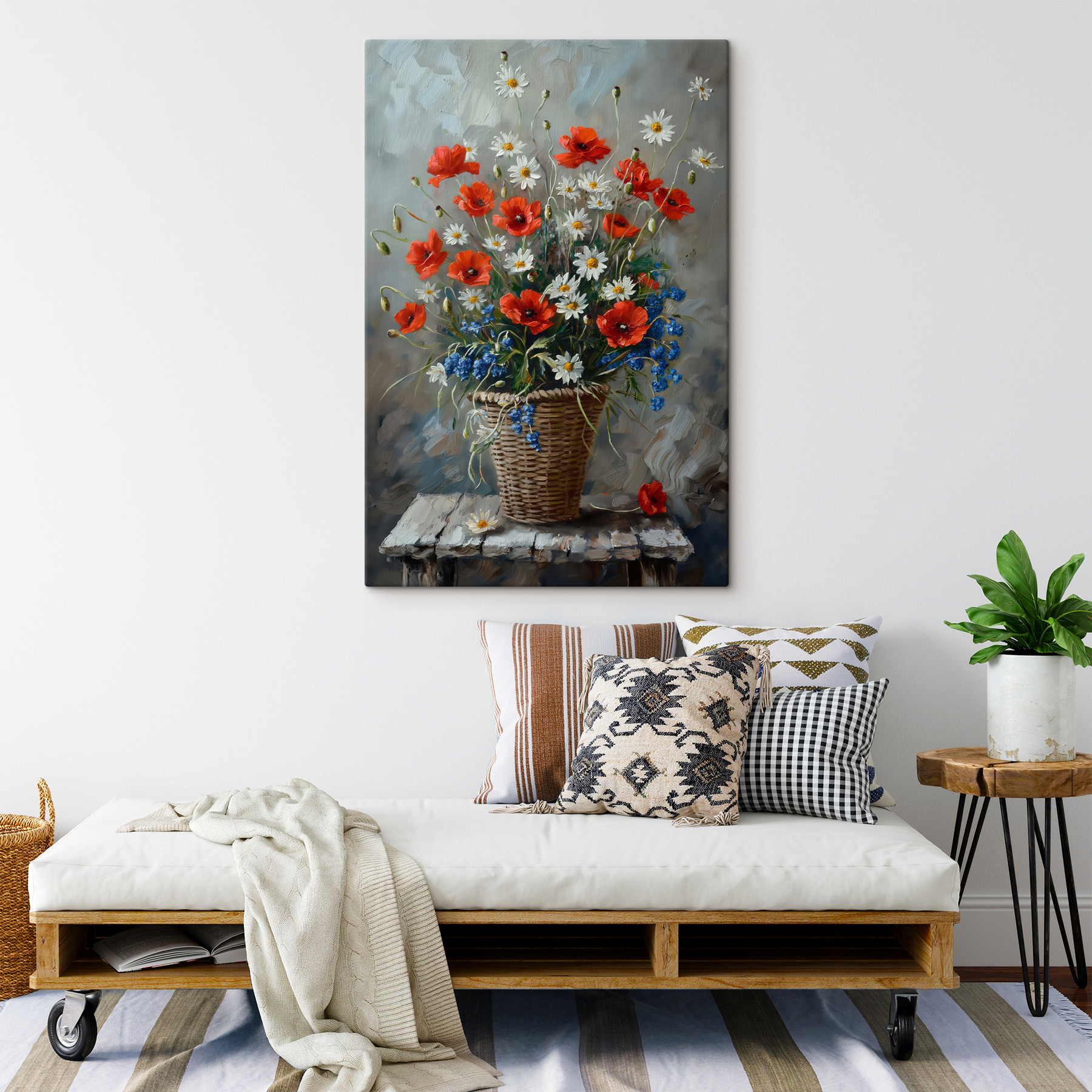 Rozjaśnij każde pomieszczenie dzięki temu wesołemu obrazowi na płótnie przedstawiającemu kwiaty w koszu. Wyobraź sobie spacer po przytulnym ogrodzie, w którym przed oczami tańczą czerwone, słoneczne biele i żywe błękity. Ten kawałek przynosi ten świeży klimat ogrodu do wnętrza, dodając odrobinę koloru do nudnych ścian. Idealny do kuchni, salonu, a nawet małego kącika, w którym pije się poranną kawę. To jak posiadanie przyjaznego bukietu, który nigdy nie więdnie i zawsze wywołuje uśmiech na twarzy. Mówiąc o niskich kosztach utrzymania – to piękno nie wymaga podlewania! Niezależnie od tego, czy jest to prezent, czy prezent dla siebie, z pewnością podniesie na duchu i wywoła radość w każdym spojrzeniu.