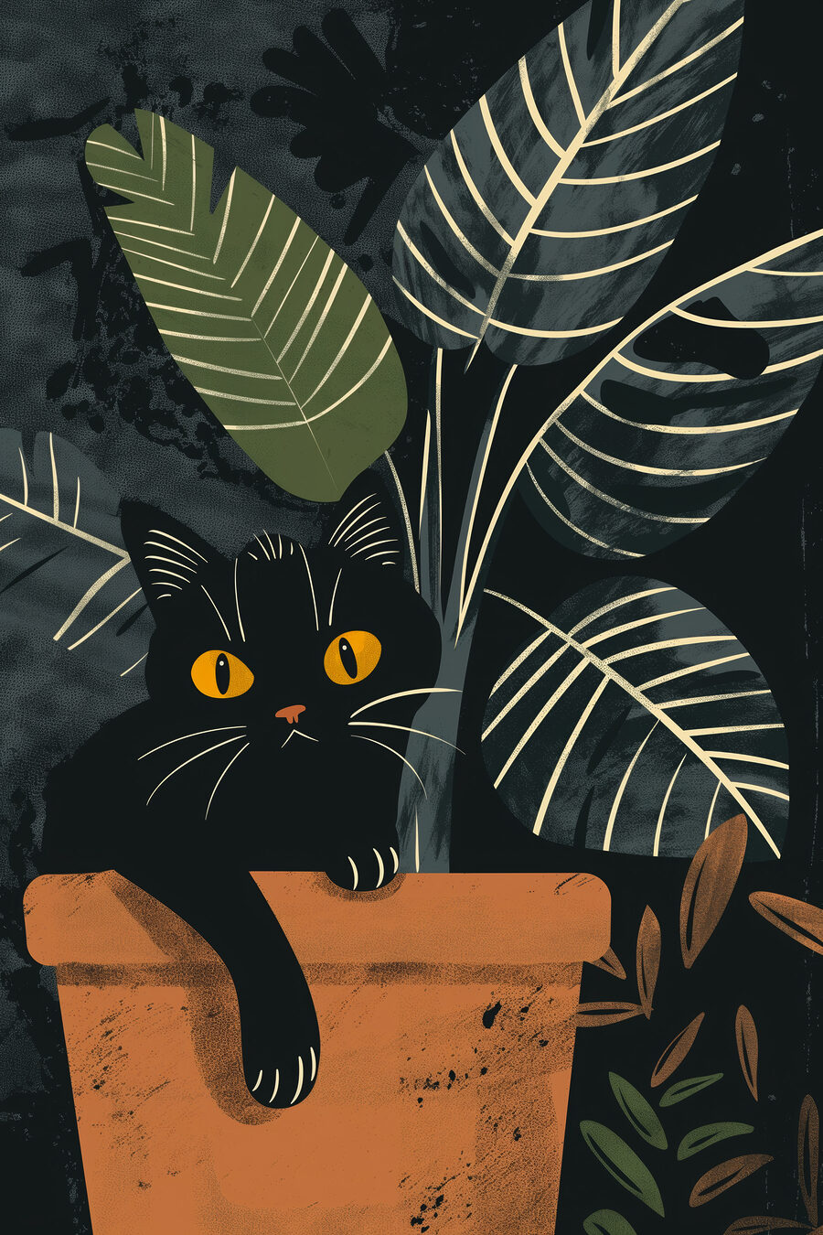 Poznaj “Obraz s40268” – idealne połączenie kaprysu i natury! Jeśli kochasz dziwaczne dekoracje i wszystko z nutą dzikiej przyrody, ten obraz jest absolutnym must-have. Wystarczy spojrzeć na tego uroczego czarnego kota wylegującego się w doniczce, otoczonego bujnymi zielonymi liśćmi. To tak, jakby kot był na mini przygodzie w dżungli w twoim salonie!
