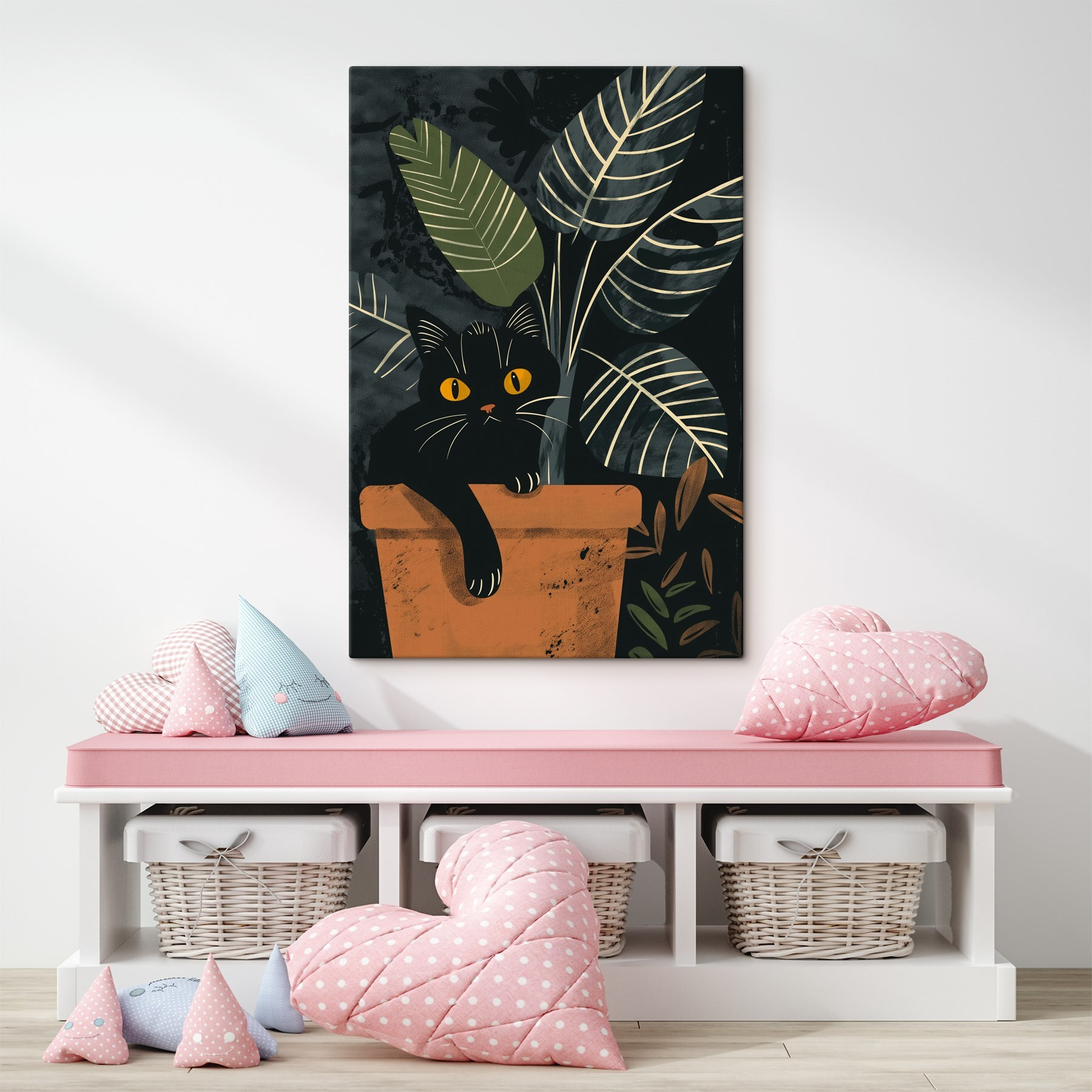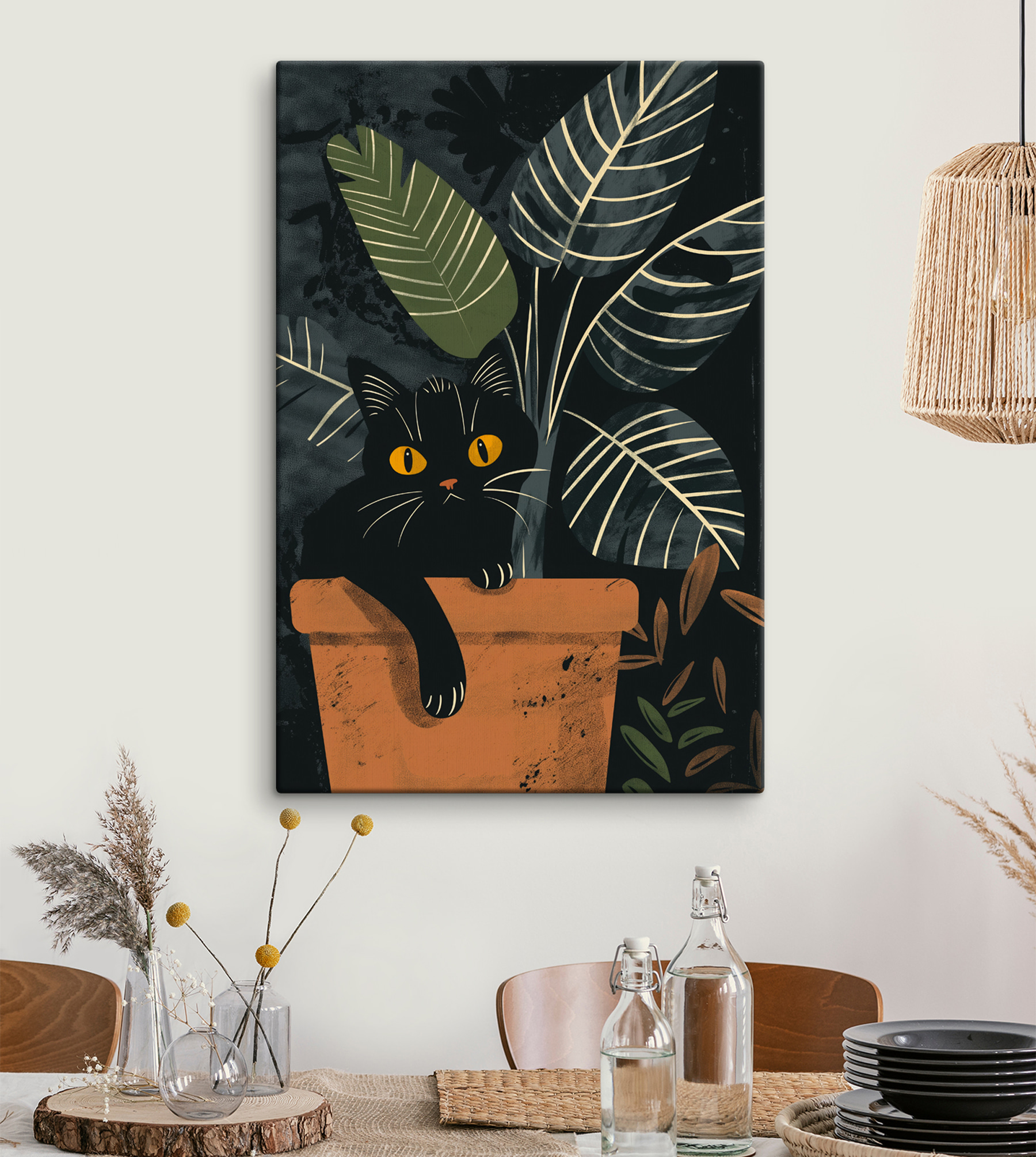 Idealny zarówno dla miłośników zwierząt, jak i entuzjastów roślin, ten obraz na płótnie wnosi ciepło i szczyptę humoru do każdego pomieszczenia. To rodzaj dzieła, które pobudza do rozmowy – “Widziałeś tego kota w doniczce? Jakby coś knuł!” – i dodaje odpowiednią ilość przytulnej, domowej atmosfery.