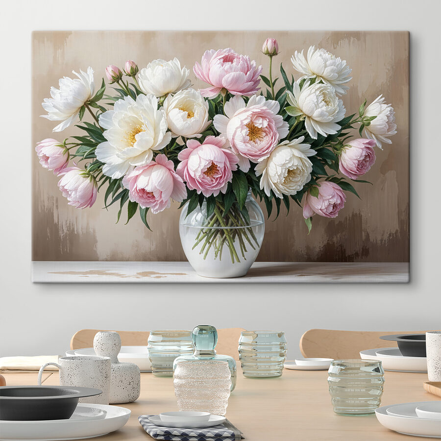 Rozjaśnij swoją przestrzeń dzięki temu wspaniałemu obrazowi na płótnie “Wazon z kwiatami na stole”. To jak przeniesienie kawałka wiosny do domu, bez konieczności podlewania! Wyobraź sobie, że wchodzisz do pokoju, w którym piwonie eksplodują kolorami – delikatnymi różami i bielami bawiącymi się razem jak starzy przyjaciele. Ciepłe, zachęcające tło dodaje przytulnego charakteru. Niezależnie od tego, czy jest to elegancki salon, czy spokojna sypialnia, to dzieło sztuki wywołuje radość i mnóstwo komplementów. Idealny do marzeń na jawie lub nadrabiania zaległości z dobrą książką, jest jak mały uścisk dla oczu. Kto by się na to nie uśmiechnął?