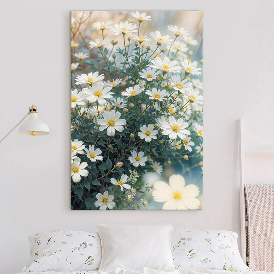 Tchnij życie w każde pomieszczenie dzięki temu zachwycającemu płótnu z wesołym skupiskiem białych kwiatów. To jak przeniesienie odrobiny słonecznego ogrodu do wnętrza, bez kichania pyłków. Wyobraź sobie, że rozjaśnia przytulny kącik do czytania lub dodaje uroku korytarzowi – to dopiero początek rozmowy! Każdy płatek zdaje się szeptać historie o wiosennej bryzie i słonecznych popołudniach. Idealny dla miłośników kwiatów lub każdego, kto chce odrobiny natury bez zwykłego utrzymania. Kto by pomyślał, że sztuka może być tak odświeżająca? To mały kawałek błogości na świeżym powietrzu w domu.
