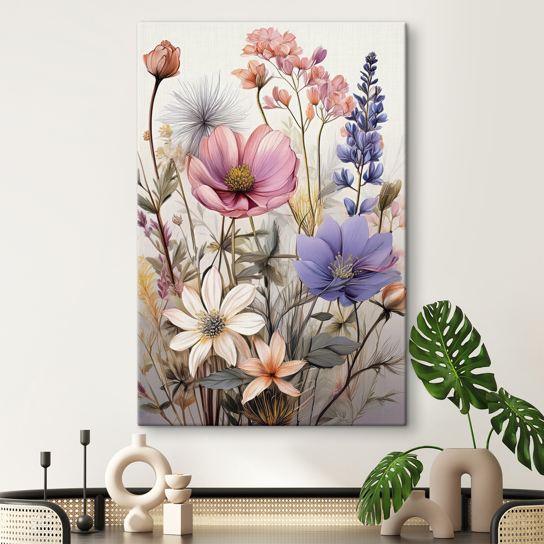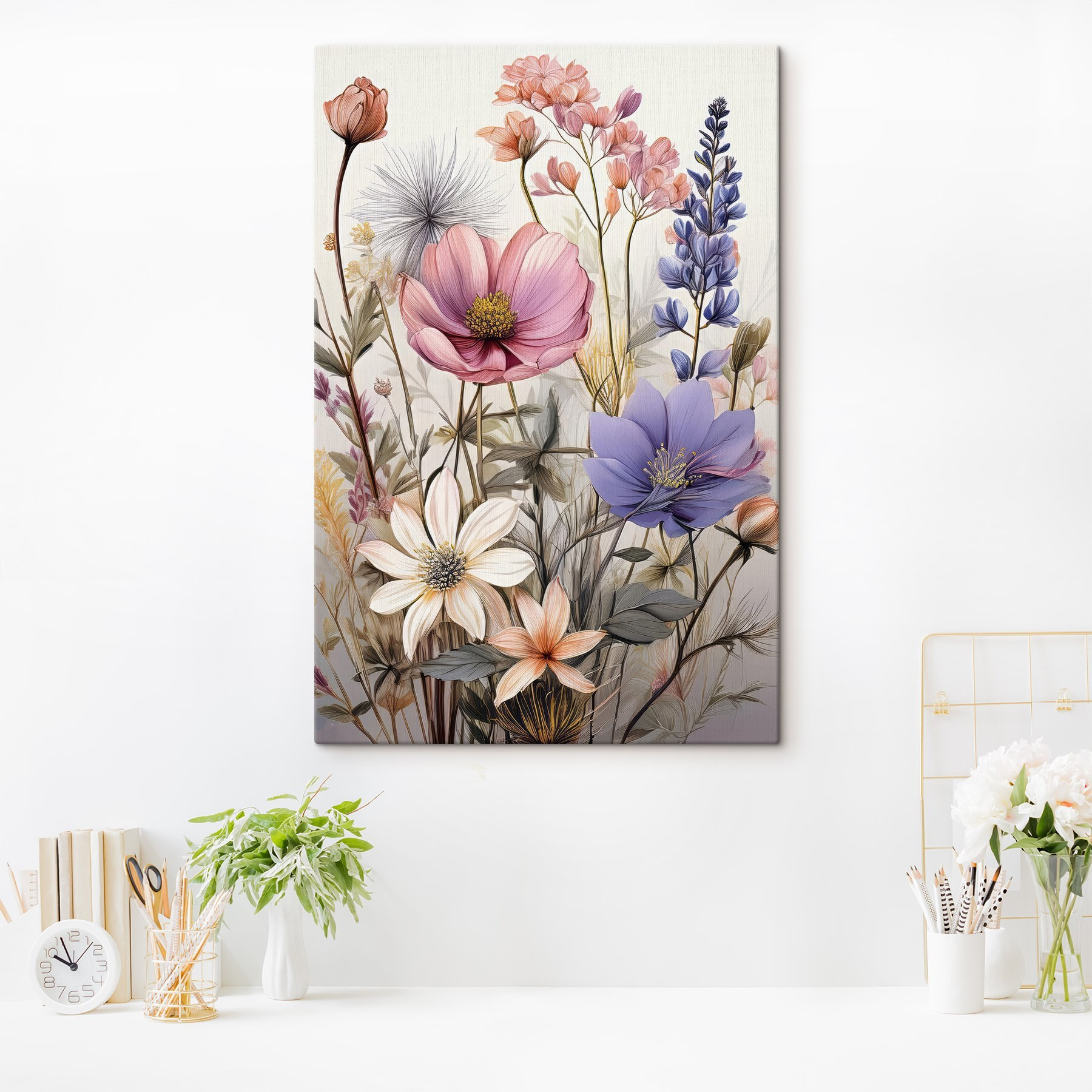 Przekształć każdą ścianę w ogród dzięki obrazowi na płótnie Symphony of Floral Elegance. Pełen kolorowych kwiatów, które wydają się tańczyć na delikatnym wietrze, ten obraz bez wysiłku wnosi powiew świeżego powietrza do wnętrza. Wyobraź sobie popijanie herbaty, podczas gdy ta żywa grafika wywołuje radość, niczym słoneczny piknik w wiosenne popołudnie. Miękkie akwarele zapraszają ciepłem i urokiem, dzięki czemu idealnie nadają się do przytulnych przestrzeni, a nawet tej jednej ściany, która potrzebuje trochę miłości. To jak bukiet, który nie więdnie – po prostu czyste, niekończące się piękno w domu.