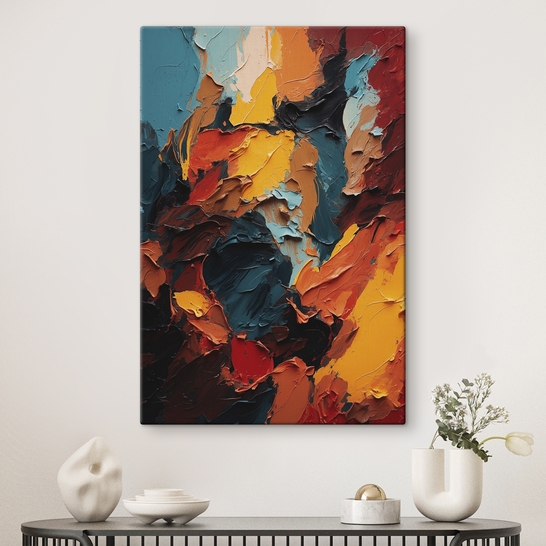 Czy kiedykolwiek zahipnotyzowała Cię feeria barw? Poznaj swoją nową obsesję – obrazy na płótnie s40457. To piękno, znalezione w kategoriach “Abstrakcje”, “Dzieła sztuki” i “Popularne”, praktycznie eksploduje odważnymi pociągnięciami i ognistymi odcieniami. To tak, jakby ktoś uchwycił dziki taniec jesiennych liści, z każdym ognistym pomarańczem, głębokim turkusem i żywą żółcią walczącą o twoją uwagę.