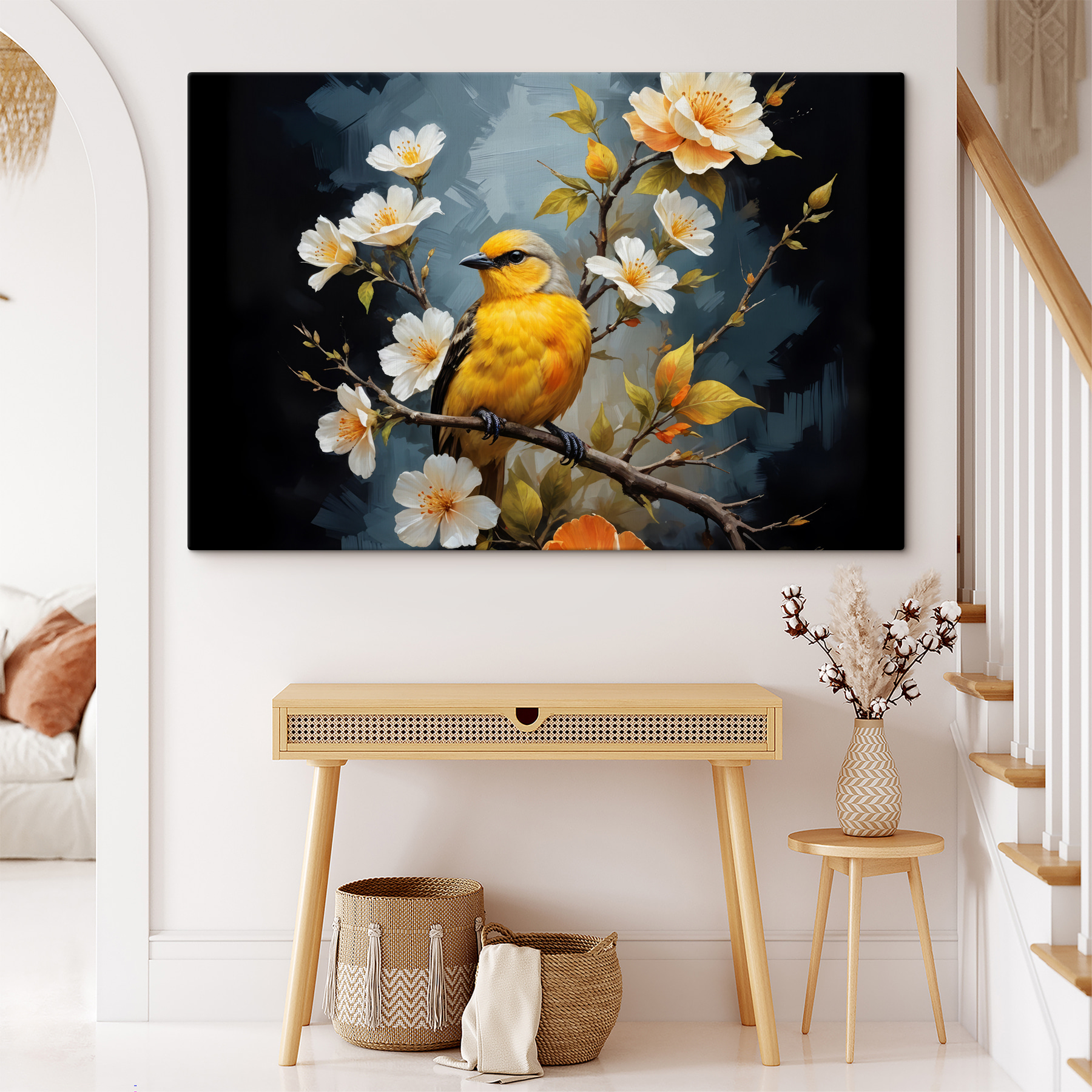 Rozjaśnij każdą ścianę za pomocą tego pięknego płótna przedstawiającego uroczego ptaka siedzącego na gałęzi ozdobionej kwitnącymi kwiatami. To jak mały kawałek natury w twoim domu, błagający o radość. Wyobraź sobie, że wchodzisz do pokoju, w którym znajduje się ten obraz – od razu czujesz się spokojniej, jakby właśnie zawiał delikatny wiosenny wietrzyk. Żywe żółcie z pewnością przyciągną wzrok, a miękkie płatki dodadzą idealnego akcentu kapryśności. Niezależnie od tego, czy jest to przytulny kącik, czy wyrazista ściana, ta grafika wnosi ciepło, urok i odrobinę świeżego powietrza do codziennego życia. Idealny dla tych, którzy kochają połączenie elegancji i odrobiny zabawy!