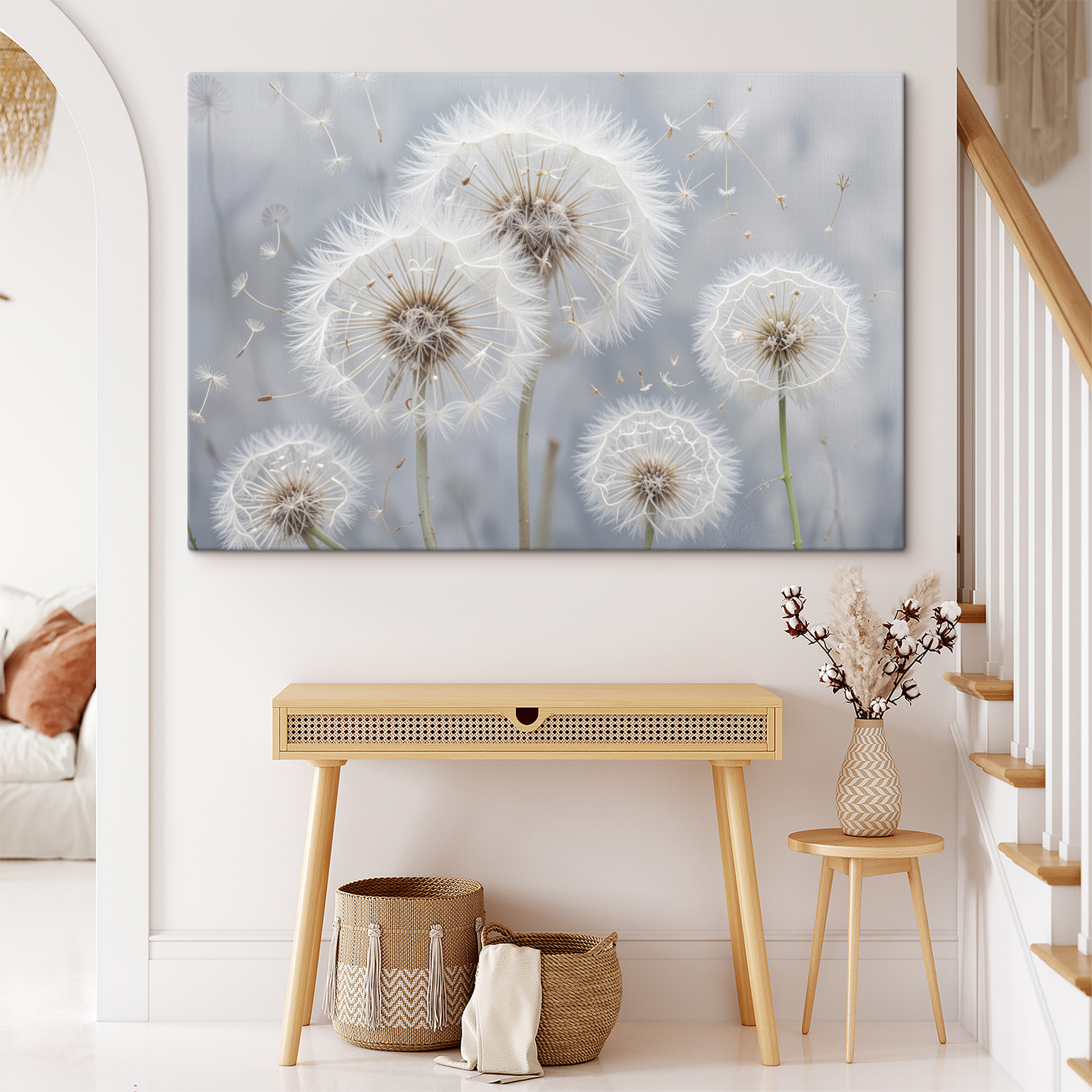 Odmień każdą przestrzeń dzięki temu czarującemu drukowi na płótnie przedstawiającemu grupę mniszków lekarskich, których delikatne nasiona unoszą się na wietrze niczym małe sny. To jak uchwycenie chwili kaprysu natury – wyobraź sobie teleportację na słoneczną łąkę za każdym razem, gdy przechodzisz obok. Idealny do salonu lub przytulnego kącika, ten kawałek przynosi delikatny dotyk spokoju. Przyjaciele mogą się zdziwić, zastanawiając się, czy wiosna jest tuż za rogiem. To delikatne przypomnienie, że piękno istnieje w drobnych szczegółach życia, a kto nie chciałby takiej atmosfery w domu?