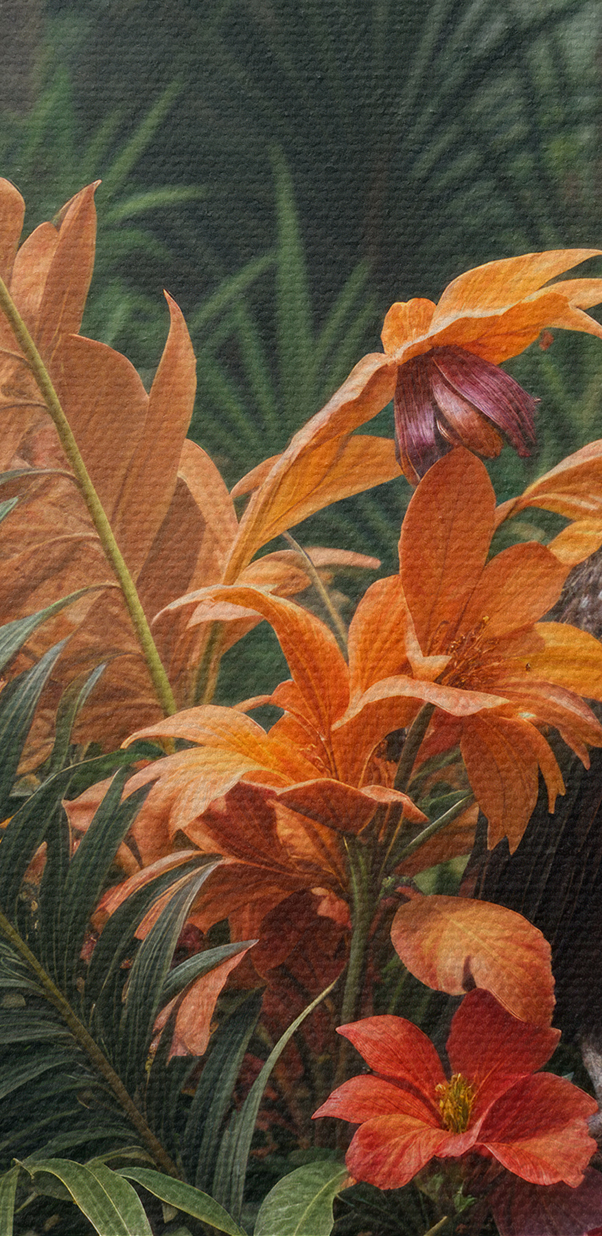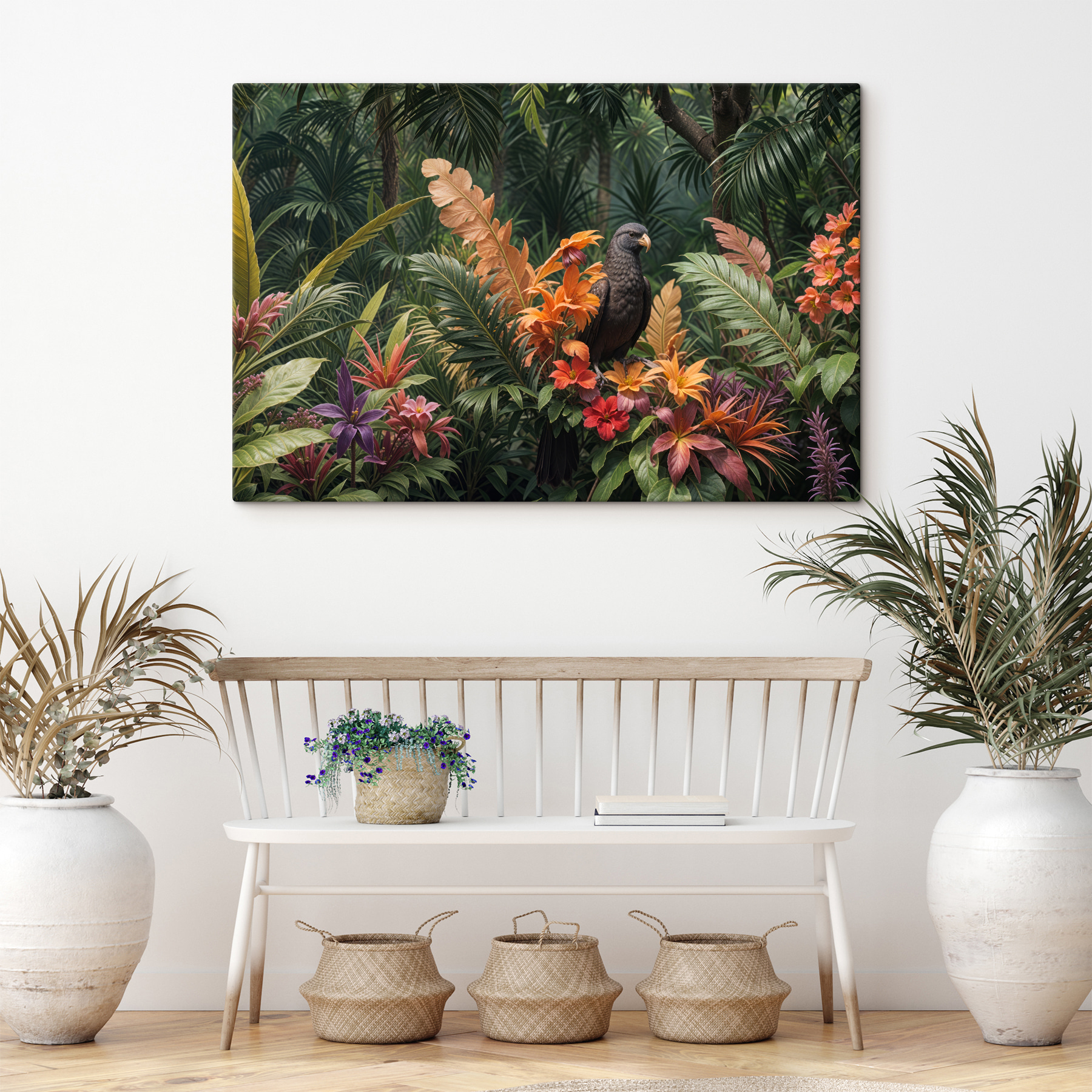Czyż ten wydruk na płótnie nie tryska życiem? “Obraz s40578” jest jak wejście do tropikalnej oazy bez wychodzenia z domu. Wyobraź sobie, że wchodzisz do swojego pokoju i wita Cię ta tętniąca życiem scena – majestatyczny ptak pośród soczystych, kolorowych kwiatów… to jak mały kawałek raju. Niesamowite kontrasty i detale sprawiają, że można niemal poczuć zapach kwiatów i usłyszeć nawoływanie ptaka.