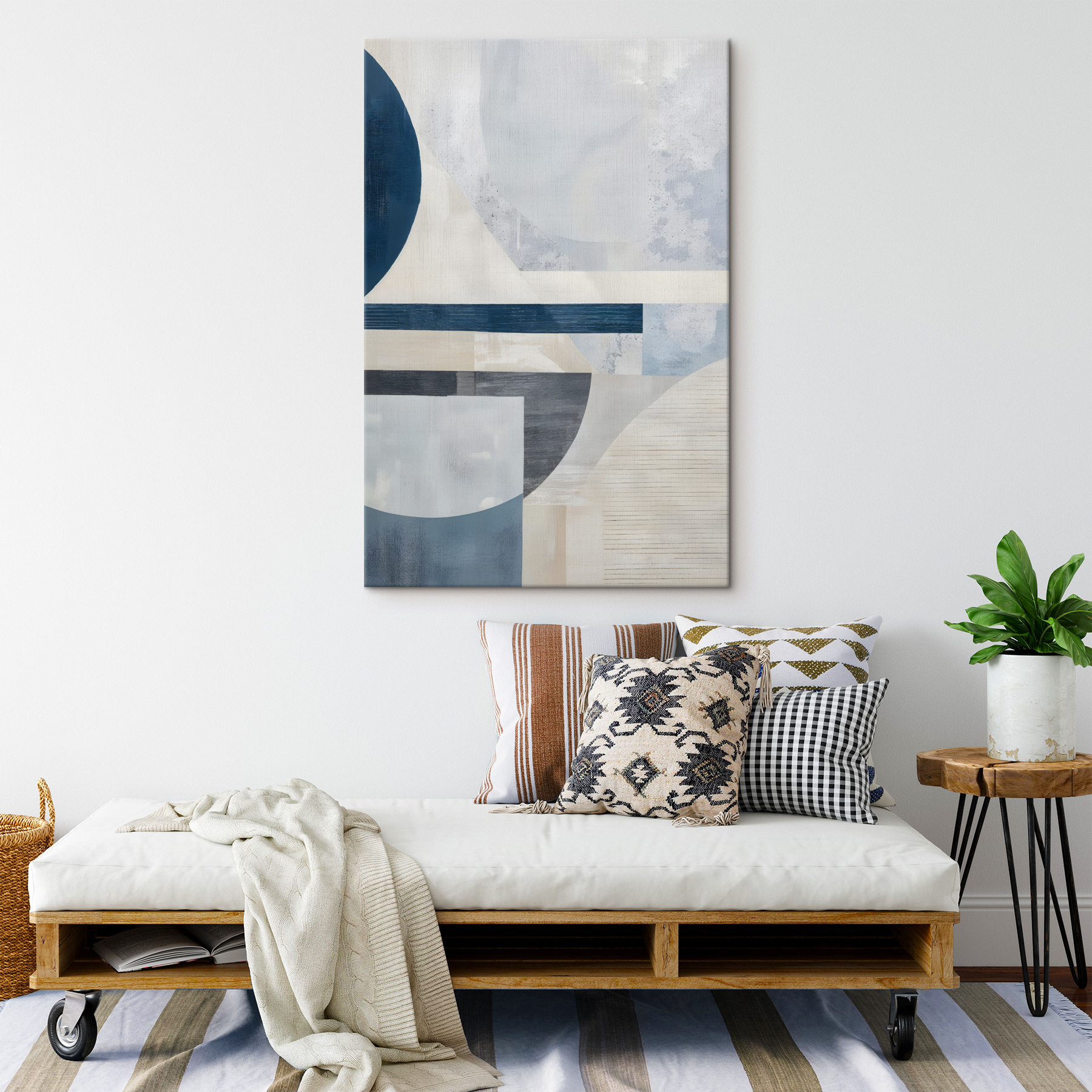 Poznaj swoje nowe ulubione dzieło sztuki. Ten wydruk na płótnie jest jak szept elegancji – w sam raz łączy w sobie abstrakcyjne i minimalistyczne klimaty. Wyobraź sobie, że wisi w Twoim salonie, gdzie po cichu kradnie show. Jest jak delikatna bryza, która odświeża całą przestrzeń, nawet tego nie zauważając. Twoi goście mogą po prostu zatracić się w jego spokojnych, kojących kształtach i delikatnych kolorach. Idealny na te chwile, kiedy potrzebujesz odrobiny spokoju po męczącym dniu. Kto by pomyślał, że spokój może przyjść w tak stylowym opakowaniu?
