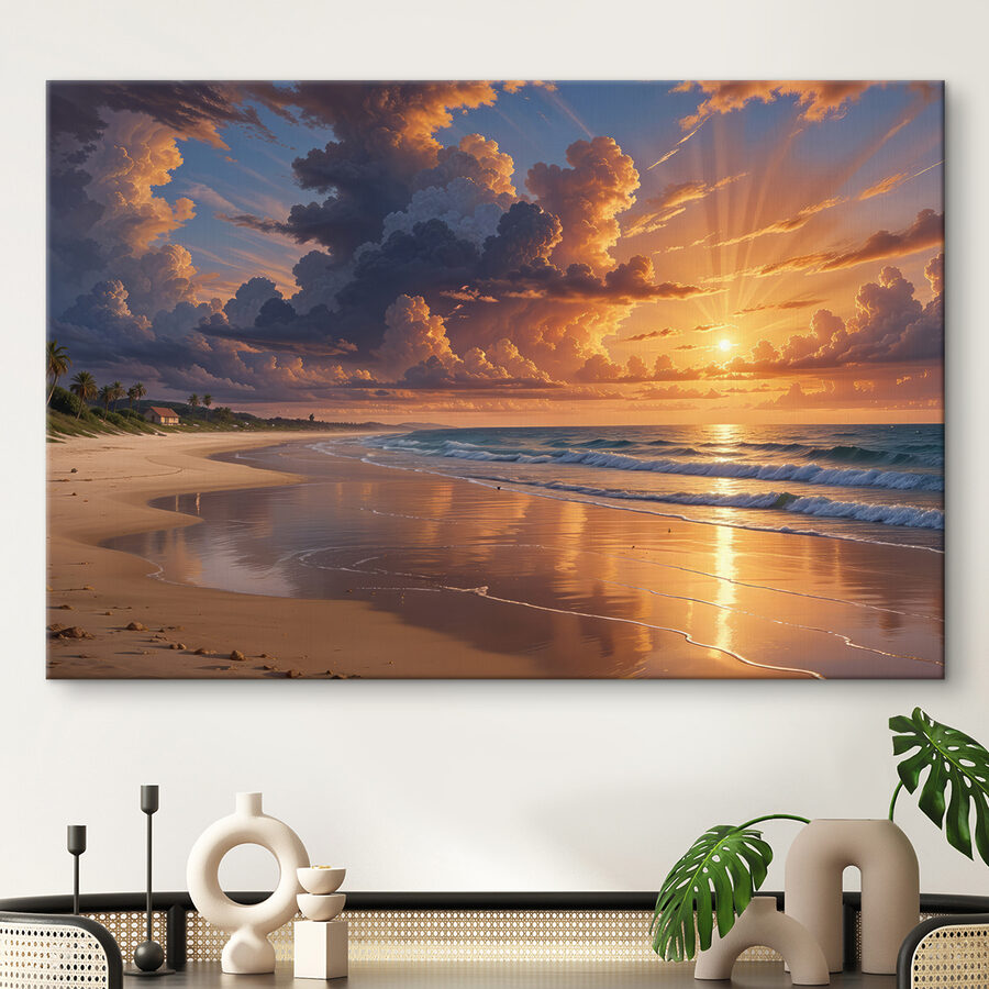 Ten wydruk na płótnie “Sunset over a Beach” to coś więcej niż tylko obraz; to mini-wakacje bezpośrednio na ścianie. Wyobraź sobie, że wracasz do domu po długim dniu, zdejmujesz buty i wita Cię ta zapierająca dech w piersiach scena. Fale praktycznie szepczą: “Zrelaksuj się, zasłużyłeś na to”. I te kolory! Są jak sposób natury na pokazanie ognistych pomarańczy i delikatnych różów tańczących po niebie. Idealne do każdej przestrzeni, która potrzebuje odrobiny spokoju. To jak codzienne przypomnienie, aby zaplanować wypad na plażę lub po prostu cieszyć się spokojną chwilą w domu.