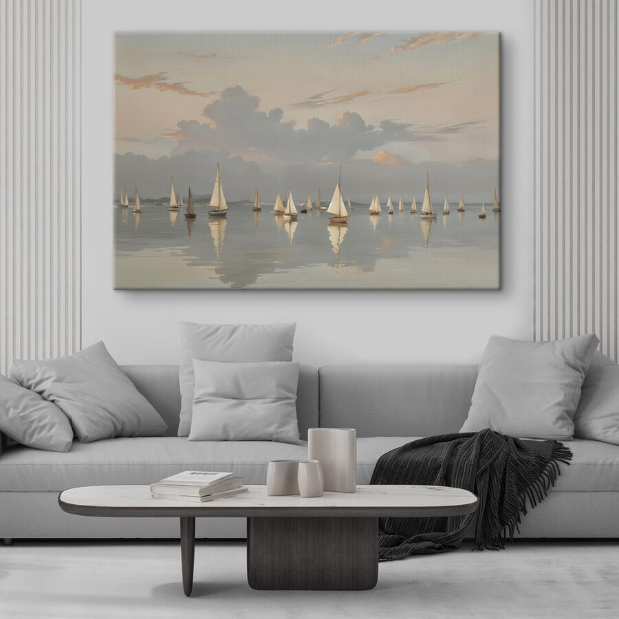 Wyobraź to sobie: grupa żaglówek leniwie dryfujących po spokojnym morzu, jakby matka natura wcisnęła przycisk drzemki. Ten obraz na płótnie doskonale oddaje ten senny nastrój. Miękkie odcienie nieba łączą się ze spokojną wodą, sprawiając, że niemal pachnie morską bryzą i przygodą. Idealny dla marzycieli lub każdego, kto kiedykolwiek tęsknił za ucieczką. Powieś go w swoim salonie lub biurze, a nagle poczujesz się tak, jakby twoje ściany miały swój własny sekretny azyl, w którym jedynym pędem jest wiatr. Nieźle, prawda?