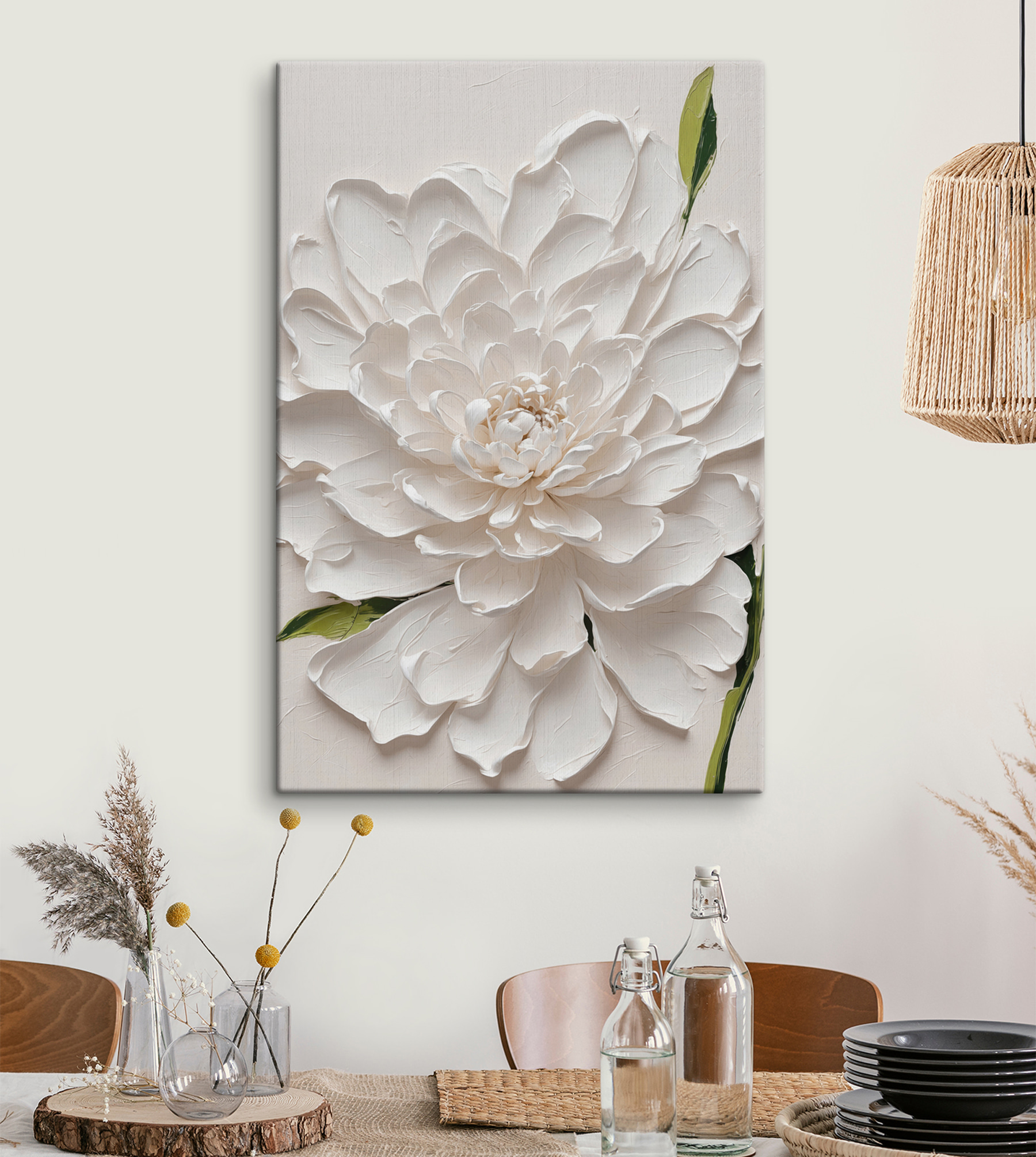Rozjaśnij każdą przestrzeń dzięki temu uroczemu drukowi na płótnie “Obraz Elegant White Blossom in Relief”. Wyobraź sobie, że wchodzisz do pokoju i witasz się z tym dużym kwiatem – to jak ciepły uścisk! Miękka biel i delikatna zieleń sprawiają, że jest on idealny do stworzenia zachęcającej atmosfery. To nie tylko sztuka; to wzmacniacz nastroju. Wyobraź sobie kogoś popijającego kawę w pobliżu, rzucającego spojrzenia na ten piękny kwiat i marzącego o wiośnie. Niezależnie od tego, czy jest to salon, sypialnia, czy nawet przytulny kącik do czytania, ten element bez wysiłku łączy elegancję i odrobinę natury. Zachwycający dodatek, który wywołuje rozmowy i uśmiechy.
