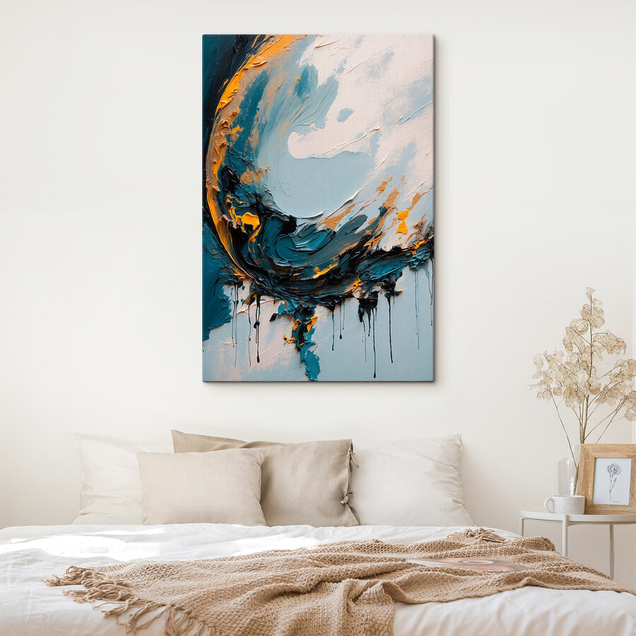 Zanurz się w morzu wirujących błękitów i ognistych pomarańczy – to płótno jest jak letnia burza złapana tuż przed zerwaniem. Idealny na te dni, kiedy marzysz o odległych miejscach lub po prostu potrzebujesz odrobiny koloru w swoim życiu. Powieszenie tego odważnego obrazu jest jak zaproszenie zachodu słońca na kolację, każdego dnia. To idealna mieszanka chaosu i spokoju, trochę jak ulubiona playlista. Niezależnie od tego, czy urządzasz salon, czy próbujesz zaimponować swojemu kotu w gabinecie – ten obraz na pewno Ci się spodoba.