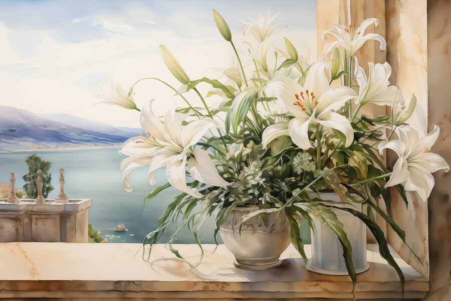 Wyobraź sobie, że wchodzisz do pokoju i witasz się z tym obrazem na płótnie przedstawiającym uroczą doniczkę pełną białych kwiatów. To jak powiew świeżego powietrza – uspokajający, a jednocześnie żywy. Wyobraź to sobie: poranna kawa w dłoni, światło słoneczne tańczące na płatkach i nagle wszystko wydaje się nieco bardziej pogodne.