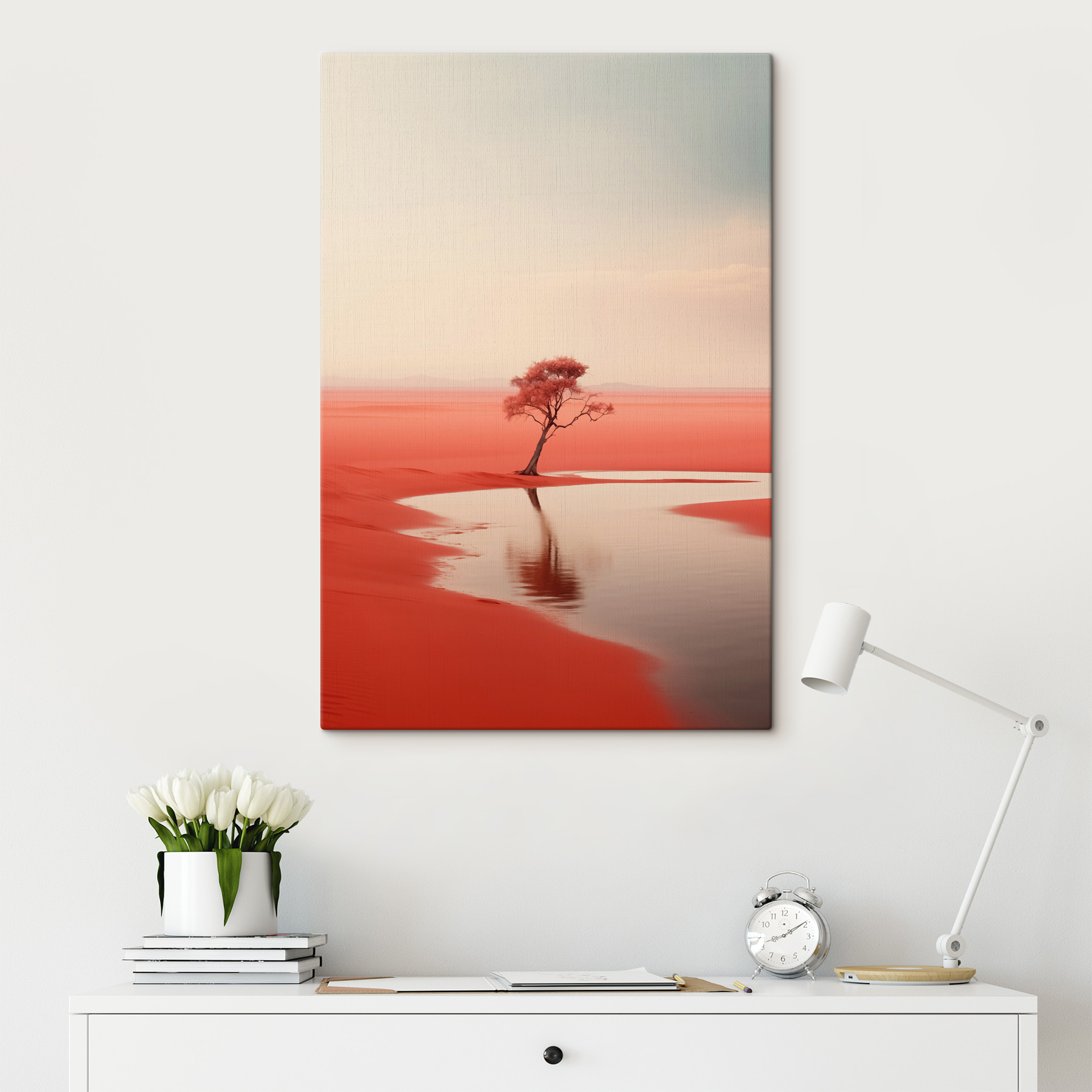 Wyobraź sobie rozległą czerwoną pustynię, gdzie samotne drzewo stoi jak dziwaczny przyjaciel na zapierającym dech w piersiach tle. Ten wydruk na płótnie “Tree in a Red Desert” oddaje istotę samotności i piękna, idealny dla każdego, kto chce dodać uderzający akcent do swojej przestrzeni. Bogate kolory wyskakują, niemal szepcząc opowieści o przygodzie i spokoju. Wyobraź sobie, że wchodzisz do pokoju i natychmiast przenosisz się do tego spokojnego krajobrazu, w którym troski znikają. To nie tylko dekoracja; to codzienne przypomnienie, aby stać wysoko i akceptować wyjątkowość. Mały kawałek artyzmu natury, który pobudzi rozmowy, a może nawet marzenia.