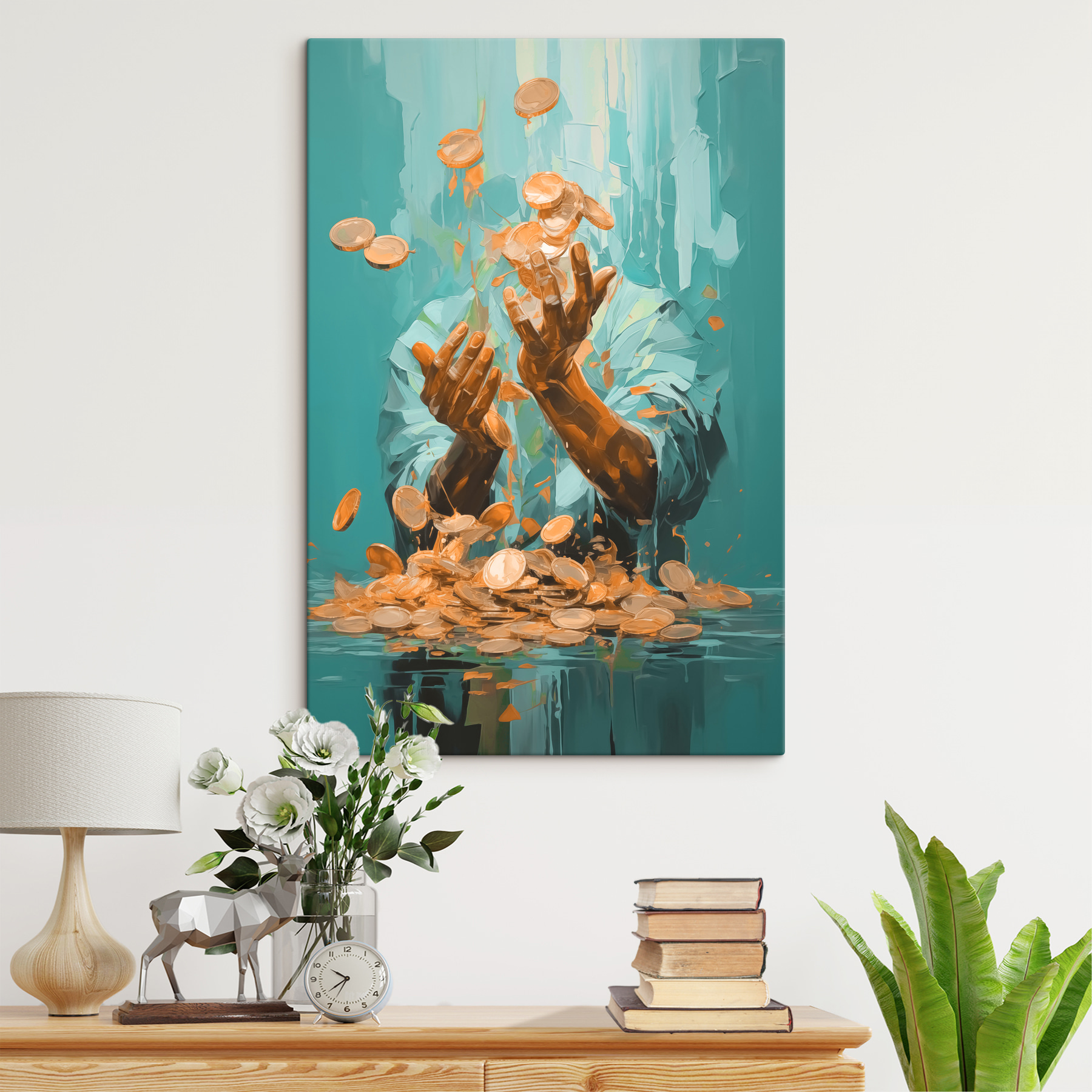 Wyobraź sobie moment zamrożony w czasie, w którym monety zdają się tańczyć w powietrzu, a wszystkie zmartwienia znikają. Ten wydruk na płótnie oddaje ten czarujący spektakl, z rękami artystycznie rzucającymi monety, które łapią światło – chwila radości i kaprysu. Niezależnie od tego, czy zostanie powieszony w przytulnym salonie, czy w tętniącej życiem przestrzeni biurowej, doda energii i szczyptę intrygi. Wyobraź sobie, że wywołuje rozmowy, gdy goście zastanawiają się, jakie marzenia kryją się za tym zabawnym gestem. To coś więcej niż sztuka; to przypomnienie o spontaniczności i znajdowaniu radości w małych rzeczach. Idealny dla każdego, kto wierzy w magię możliwości.