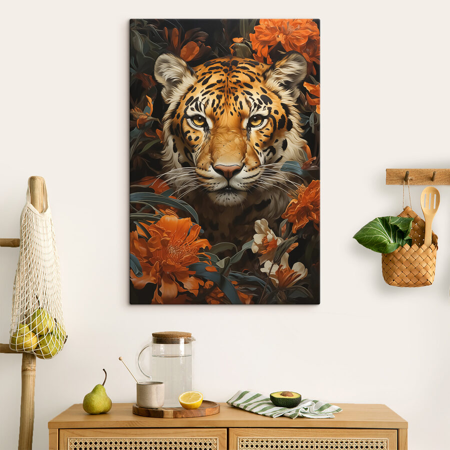 Wejdź do tętniącej życiem dżungli dzięki obrazowi na płótnie “Tygrys wśród bujnych pomarańczowych kwiatów”. Ten oszałamiający obraz przedstawia odważnego tygrysa z przodu i na środku, zaciekle otoczonego przez piękne pomarańczowe kwiaty. Wyobraź to sobie w swoim salonie – to tak, jakbyś miał dzikiego towarzysza gotowego do skoku na Twój dzień! Kolory są tak żywe, że praktycznie kipią energią, zachęcając gości do uśmiechu, a przyjaciół do zazdrości. Idealny do dodania popu osobowości, to nie tylko wystrój; to początek rozmowy i codzienna inspiracja. Kto nie poczułby się trochę bardziej odważny z tym pięknem na ścianie?