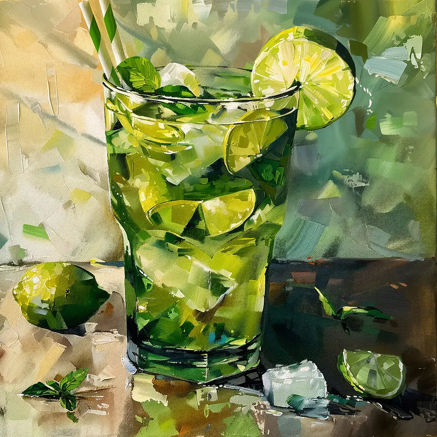 Wyobraź sobie, że wracasz do domu po długim dniu, rzucasz klucze na stół i spoglądasz w górę, aby zobaczyć to błyszczące płótno na ścianie – natychmiast orzeźwiające, jak pierwszy łyk idealnie schłodzonego napoju. Żywa zieleń limonki, lśniące kostki lodu i te bezczelne małe listki mięty zapraszają powiew spokoju do tańca w Twojej przestrzeni. To jak mini-wakacje w formie akwareli, idealne do kuchni, jadalni lub wszędzie tam, gdzie przydałaby się odrobina radości i mrugnięcia okiem do natury. Idealny dla każdego, kto ceni sobie odrobinę zabawy w swoim wystroju. Na zdrowie!
