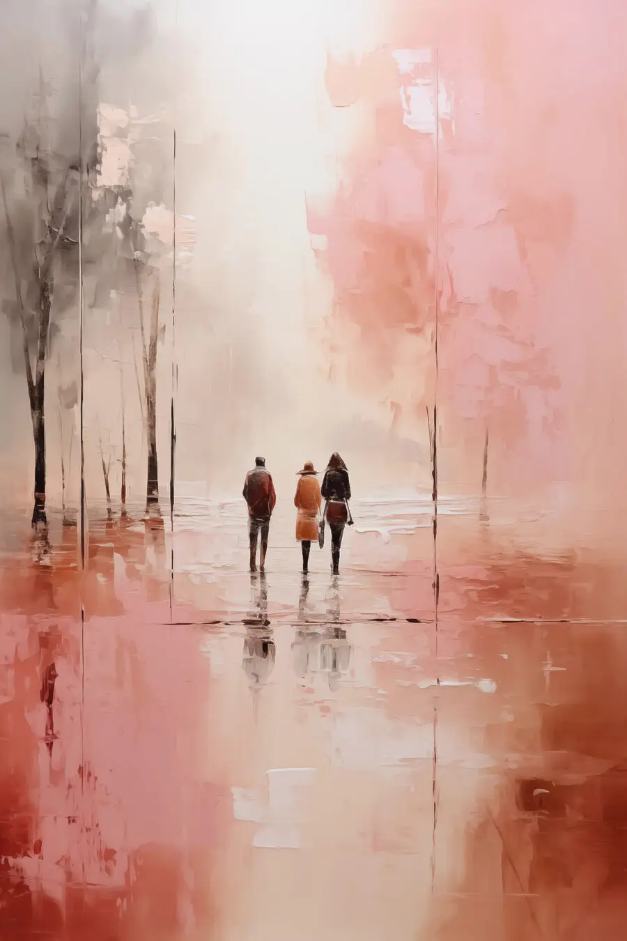 Wyobraź to sobie: spacer w deszczowy dzień zamieniony w dzieło sztuki. “Obraz Group of People Walking on a Wet Street” oddaje istotę tych pogodnych, refleksyjnych chwil, gdy delikatna mżawka budzi miasto. Dzieło to wprowadza przytulny nastrój do każdego pomieszczenia dzięki delikatnym kolorom i sposobowi, w jaki postacie elegancko wtapiają się w magię akwareli. Idealny do urozmaicenia pustej ściany, w którą się wpatrujesz. Pomyśl o tym jako o wizualnej ucieczce – bez konieczności szukania parasola!