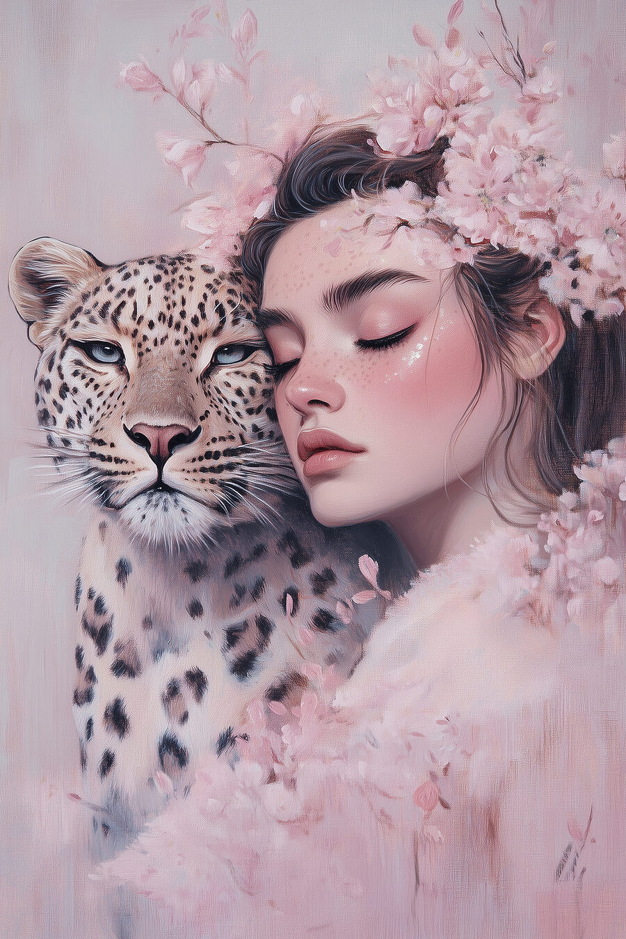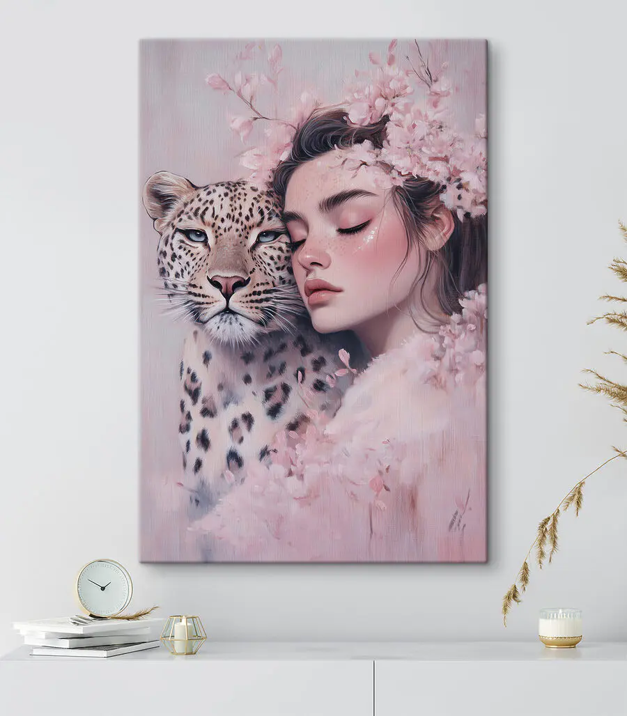 Wyobraź sobie spokojne niedzielne popołudnie, słońce wpadające przez prześwitujące zasłony. Na ścianie “Kobieta z gepardem” po cichu przyciąga uwagę – hipnotyzujące połączenie elegancji i dzikiego ducha. Spokojny wyraz twarzy kobiety, przylegającej policzkiem do policzka majestatycznego kota, zachęca do medytacji; delikatne różowe kwiaty dodają szeptu romantyzmu. Idealny do przytulnego kącika lub kreatywnego studia, ten element przywołuje senną przygodę – jak sekretny ogród, w którym wszystko jest możliwe. To coś więcej niż dekoracja; to nastrój.