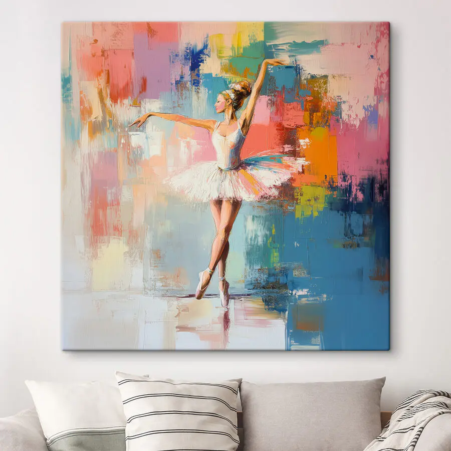Tańcząca w Twoim salonie, ta grafika na płótnie przedstawia baletnicę, która wydaje się zeskakiwać ze ściany. Wyobraź sobie plusk kolorów – delikatne pastele mieszają się, jakby były na najlepszej imprezie. Jej tutu wiruje z wdziękiem wiosennej bryzy! To trochę abstrakcja, trochę sztuka i mnóstwo elegancji. Wyobraź sobie, że popijasz poranną kawę lub odpoczywasz po długim dniu, a ta tętniąca życiem scena przypomina ci, abyś zatańczył trochę w swoim życiu. Idealny dla tych, którzy cenią sobie odrobinę kaprysu w swojej sztuce!