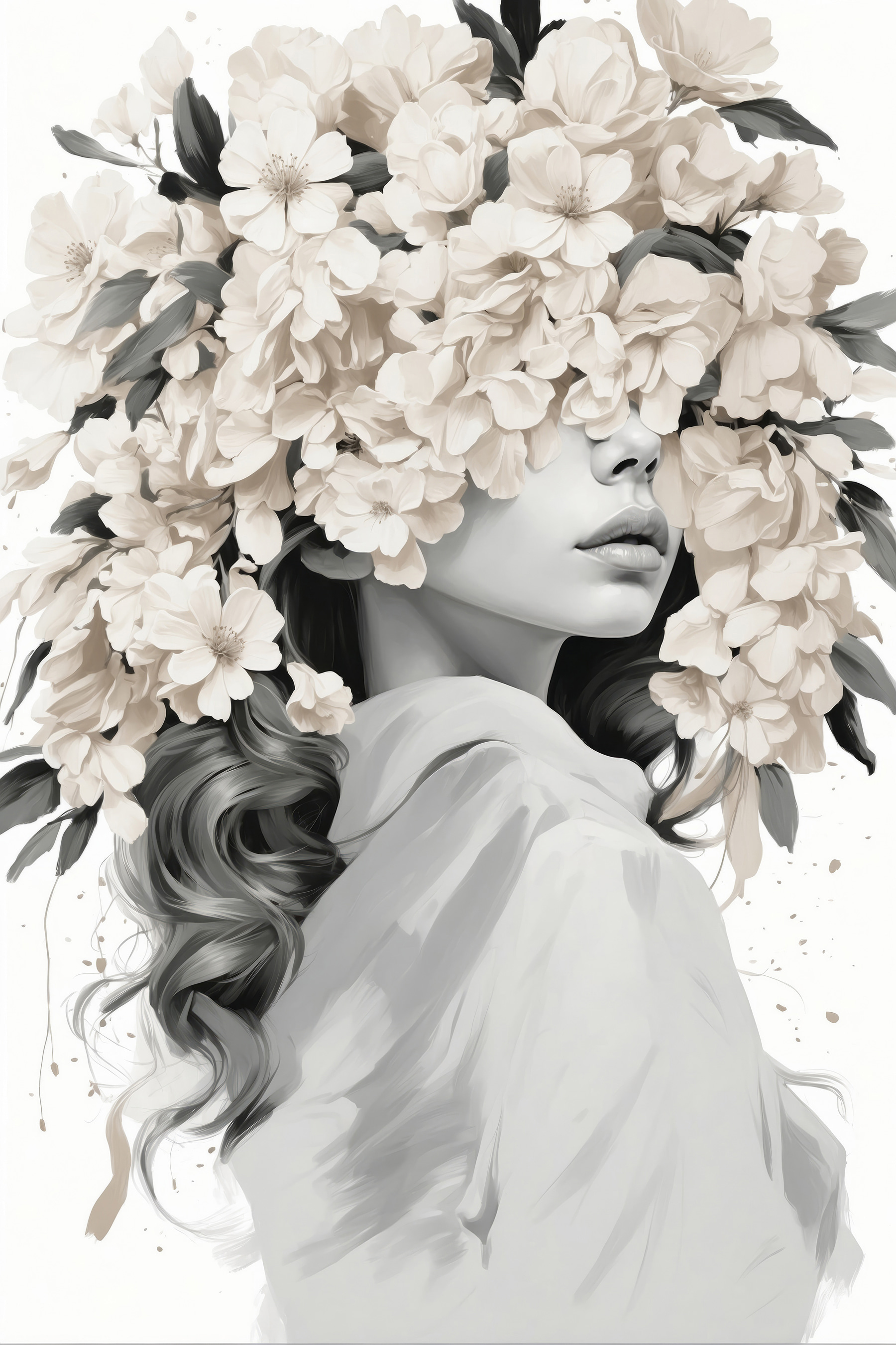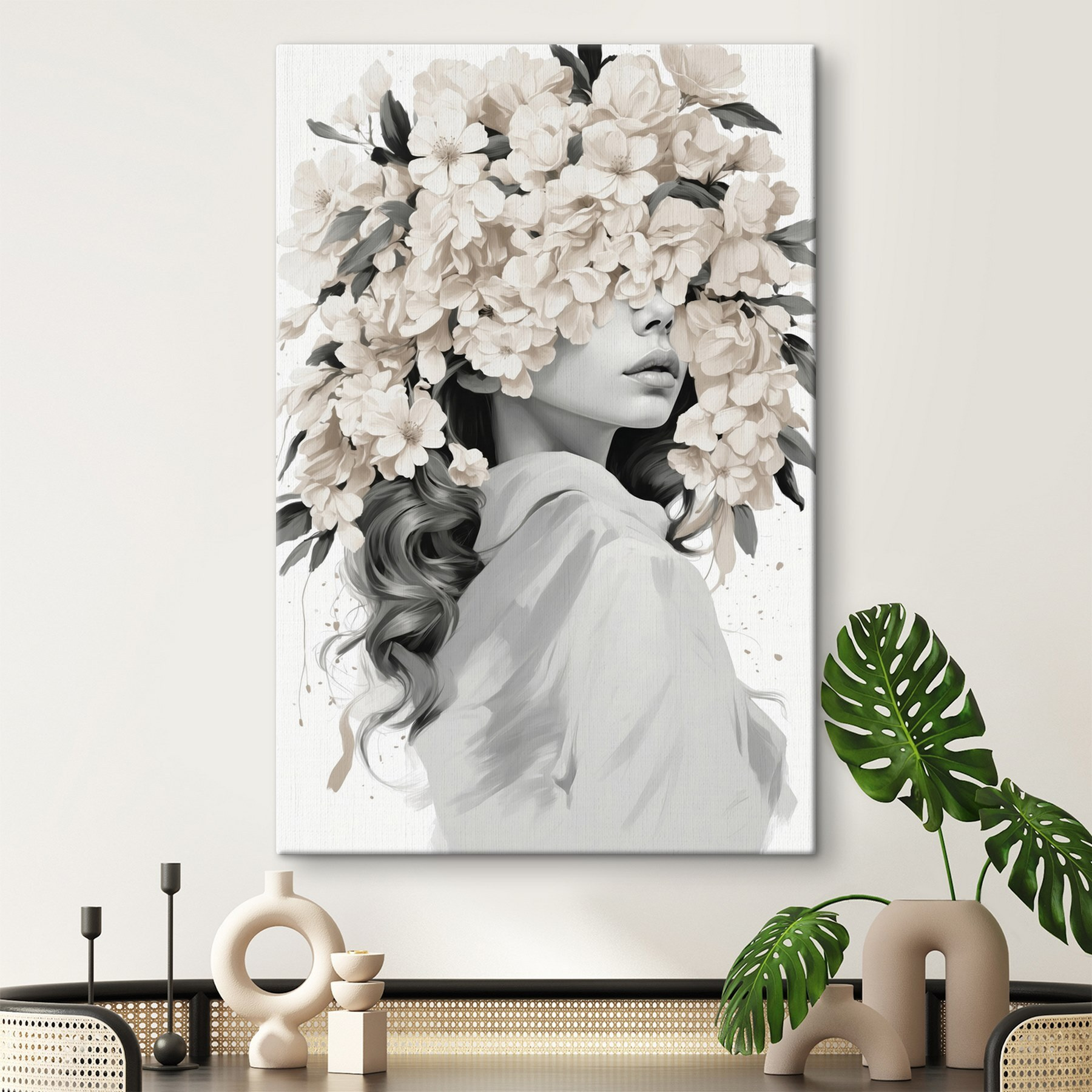 Wyobraź sobie, że wchodzisz do pokoju i wita Cię ten wspaniały obraz na płótnie. Kobieta ozdobiona bukietem kwiatów, jej piękno miękko wtapiające się w delikatne kwiaty. Wciąga do środka, wywołując myśli o wiosennych dniach i delikatnej bryzie. Idealny do przytulnego zakątka lub pustej ściany błagającej o odrobinę uroku, ten kawałek ma sposób na szeptanie elegancji, jednocześnie utrzymując rzeczy bez wysiłku. Przyjaciele zatrzymają się i będą podziwiać, a może nawet trochę pomarzą. To jak rozmowa ze sztuką – urocza, pełna kwiatów pogawędka, która rozjaśnia atmosferę i ożywia każdą przestrzeń. Prawdziwy showstopper!