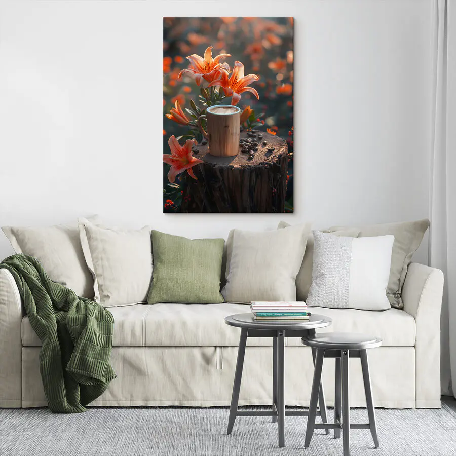 Wyobraź to sobie: przytulny kącik, poranna kawa delikatnie parująca i płótno, które przenosi plener do środka. “Filiżanka kawy na pniu z pomarańczowymi kwiatami” to coś więcej niż sztuka – to zaproszenie. Te żywe pomarańczowe kwiaty praktycznie mrugają do ciebie, podczas gdy rustykalny pień szepcze tajemnice lasu. Jest idealny do tego miejsca w domu, które potrzebuje odrobiny kaprysu i ciepła. Jak poranny uścisk, ten element przypomina, że proste radości, takie jak kawa i kwiaty, są wszędzie wokół.