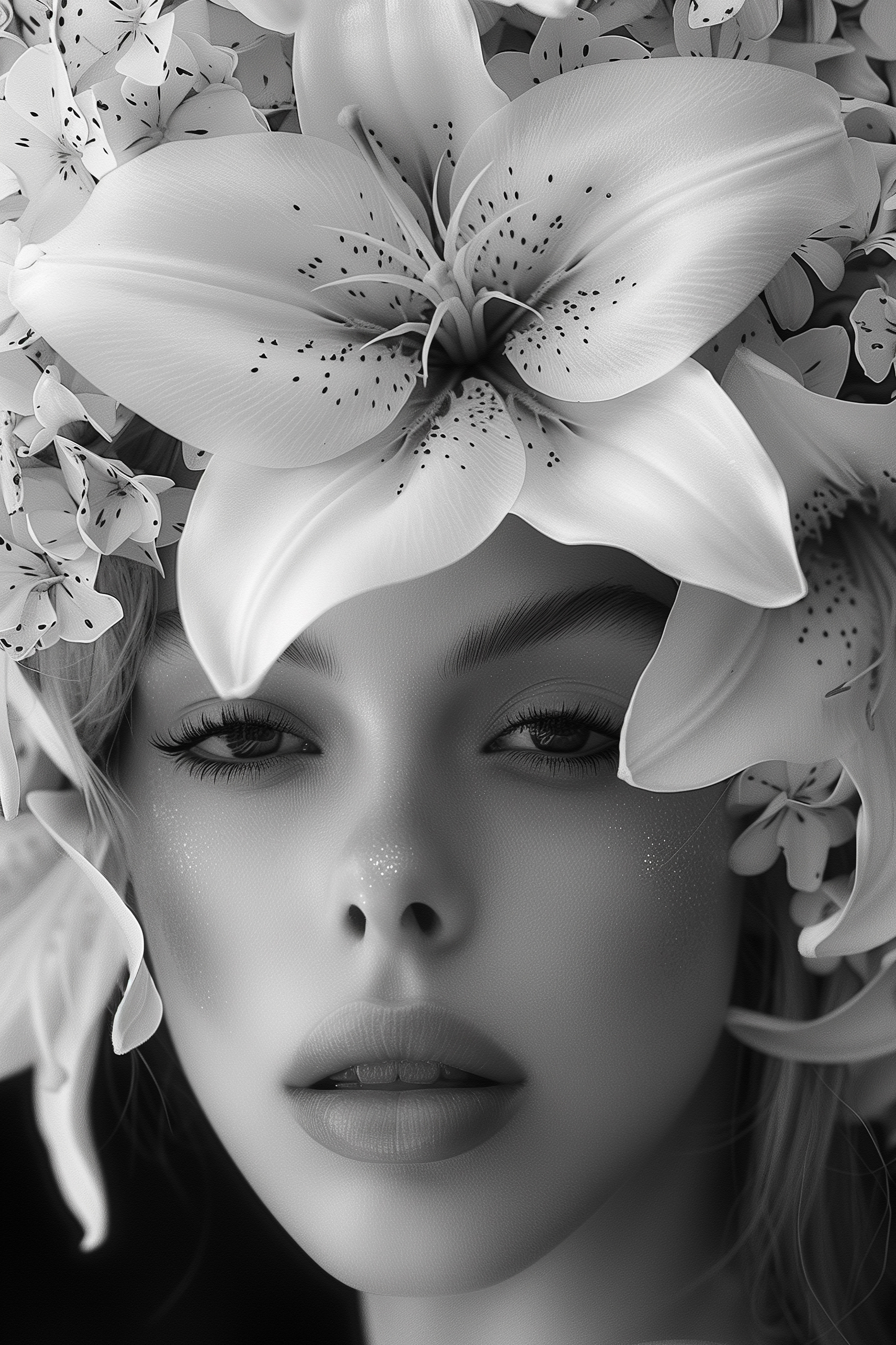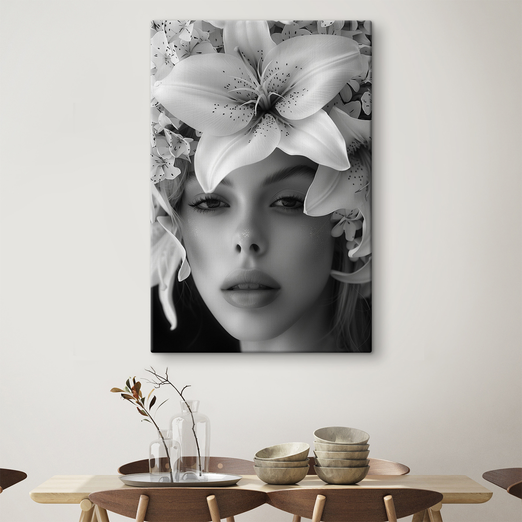 Wyobraź sobie, że wchodzisz do pokoju i wita Cię uderzające płótno – “Kobieta z kwiatami na głowie”. To nie tylko sztuka; to początek rozmowy. Czarno-biała paleta dodaje elegancji, a kwiatowa korona wprowadza nutkę kaprysu. Wyobraź to sobie: przyjaciele na kawie, wszyscy podziwiają i rozmawiają o jej pogodnym wyrazie twarzy i tych oszałamiających kwiatach. To jak odrobina magii ogrodu we wnętrzu! Idealny dla miłośników kwiatów i każdego, kto ceni piękno z nutką intrygi. Twoje ściany będą ci wdzięczne.