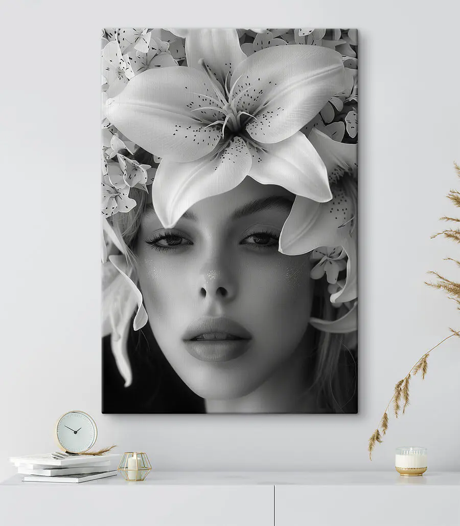 Wyobraź sobie, że wchodzisz do pokoju i wita Cię uderzające płótno – “Kobieta z kwiatami na głowie”. To nie tylko sztuka; to początek rozmowy. Czarno-biała paleta dodaje elegancji, a kwiatowa korona wprowadza nutkę kaprysu. Wyobraź to sobie: przyjaciele na kawie, wszyscy podziwiają i rozmawiają o jej pogodnym wyrazie twarzy i tych oszałamiających kwiatach. To jak odrobina magii ogrodu we wnętrzu! Idealny dla miłośników kwiatów i każdego, kto ceni piękno z nutką intrygi. Twoje ściany będą ci wdzięczne.