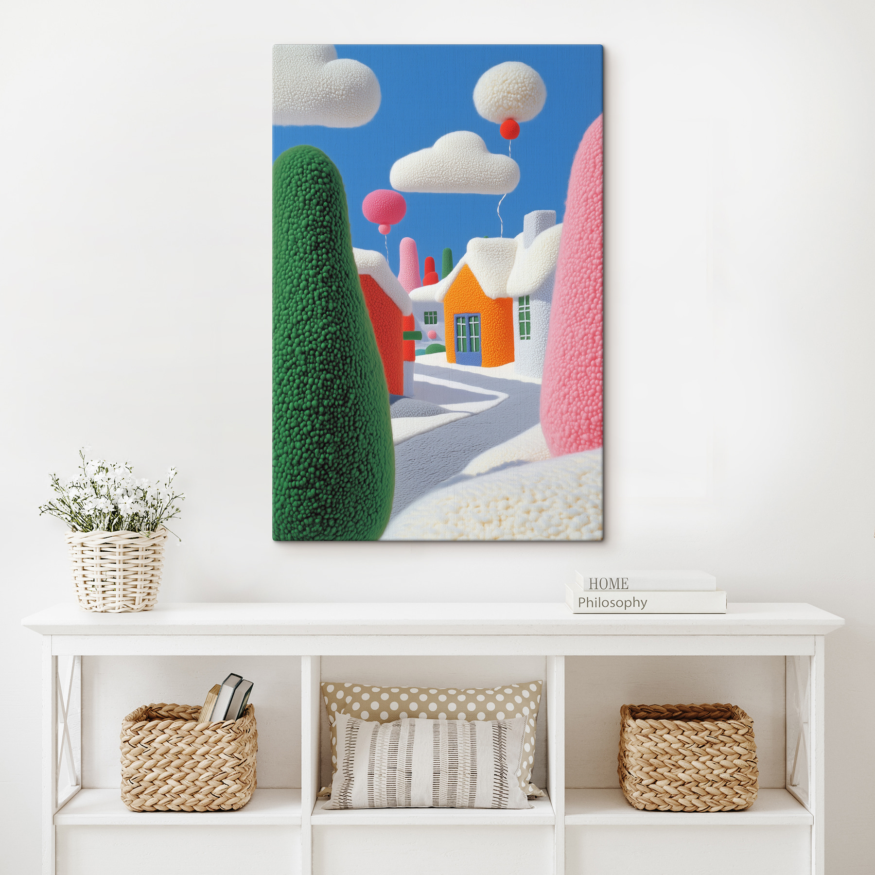 Wejdź do kapryśnej krainy czarów z obrazem na płótnie “Cartoon Town”. To jak przyjazny zakątek wyobraźni, w którym drzewa noszą rozmyte swetry, a balony unoszą się w snach. Wyobraź to sobie: odrobina radości, która jest jak uścisk słonecznego popołudnia. Idealny na te dni, kiedy trzeba się uśmiechnąć i przypomnieć sobie, że świat może być uroczy i dziwaczny. Świetnie nadaje się do przestrzeni, które potrzebują odrobiny szczęścia – wyobraź go sobie w przytulnym kąciku do czytania, inspirując kreatywność i wypełniając serce ciepłem dziecięcego śmiechu. Prosty, uroczy i zachwycająco nieoczekiwany.