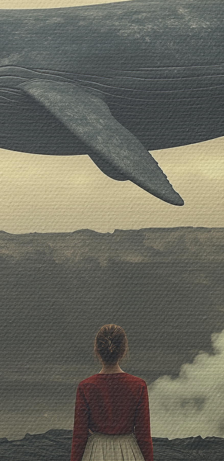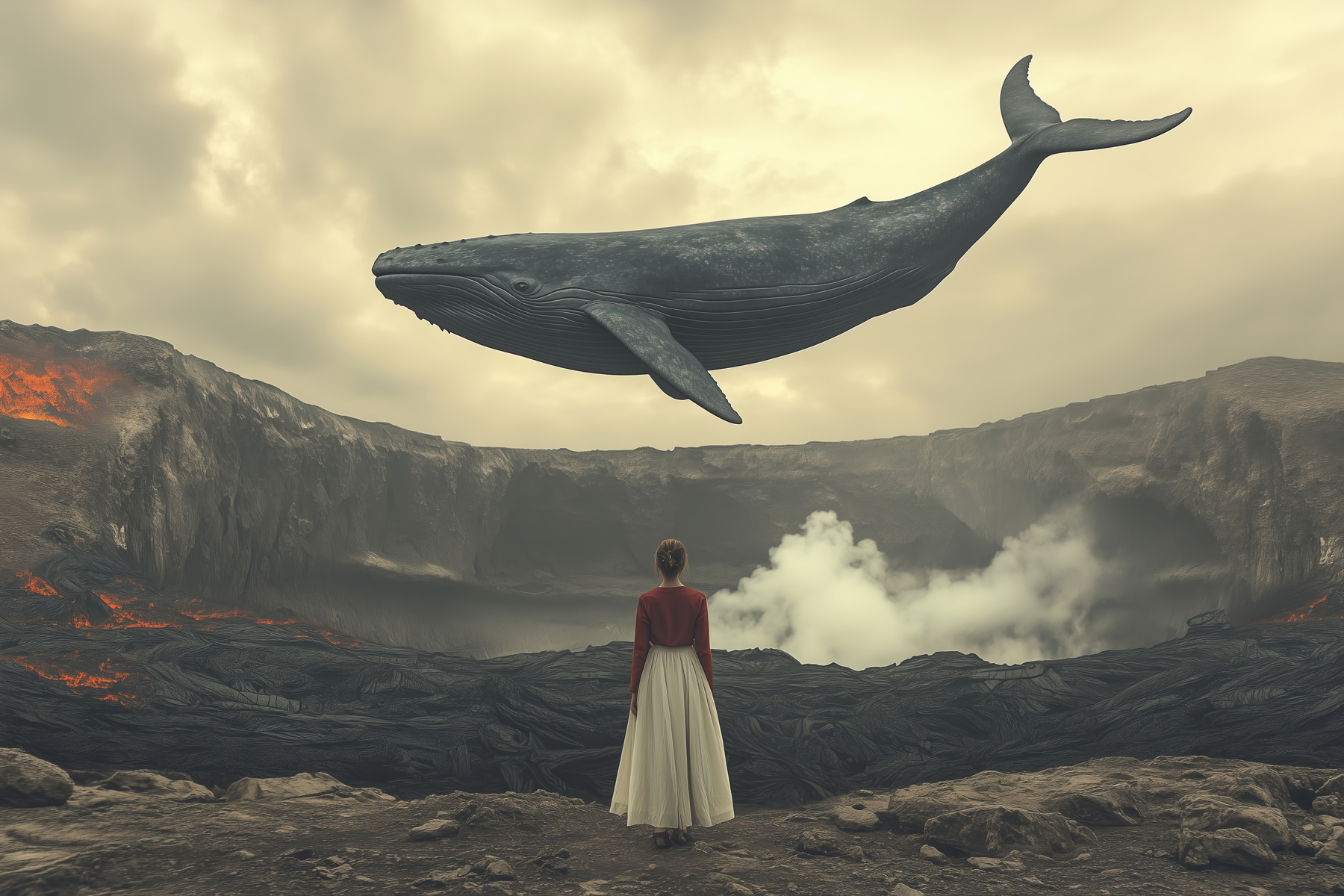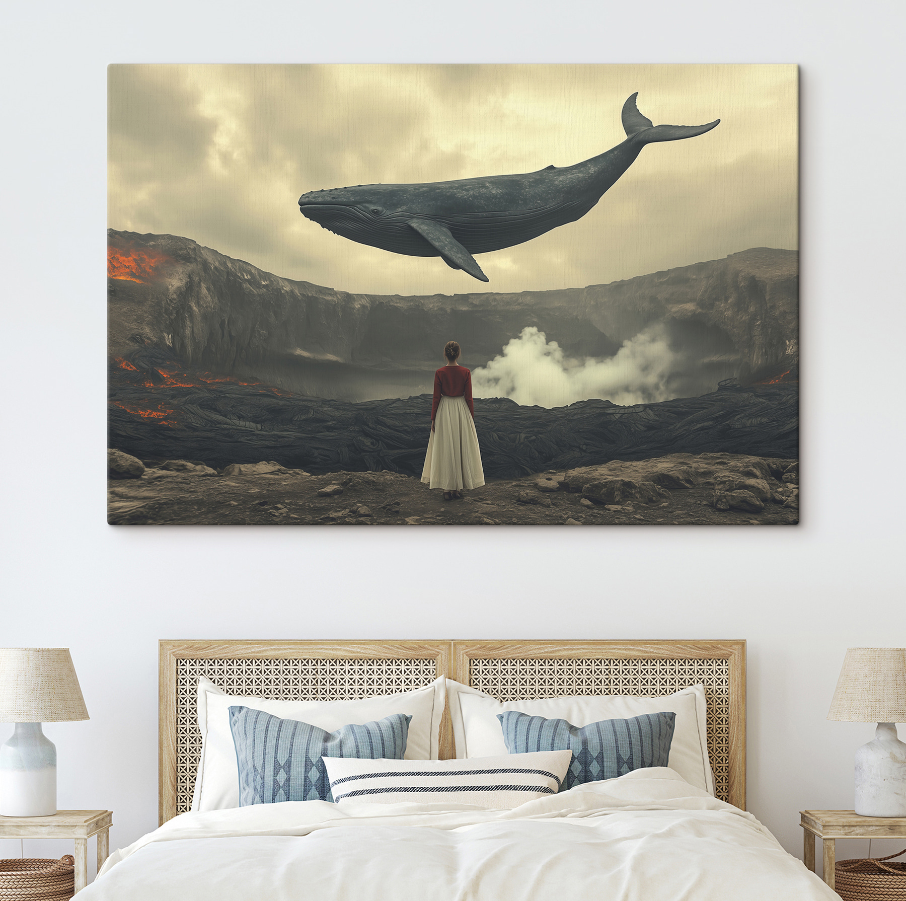 Zanurz się w świecie cudów dzięki temu drukowi na płótnie, na którym pogodna kobieta patrzy na ogromnego wieloryba szybującego nad wulkanem. Nie każdego dnia można zobaczyć wieloryba podczas przejażdżki nad lawą – to widok, który pobudza marzenia! Ta dekoracja doda każdej ścianie natychmiastowego dramatyzmu i odrobiny fantazji. Wyobraź sobie, że rozjaśnia salon lub inspiruje do rozmów w przytulnym kąciku. Ciepłe kolory i intrygująca scena wzbudzają ciekawość i podziw, dzięki czemu jest idealny dla każdego, kto docenia piękno i tajemnicę natury. Prawdziwy showstopper, prawda?