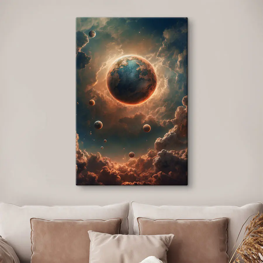 Czy kiedykolwiek myślałeś o unoszeniu się wśród gwiazd bez wychodzenia z salonu? “Obraz Planet in the Sky” to strzał w dziesiątkę. To tak, jakby mieć swój własny wszechświat bezpośrednio na ścianie – minus zerowa grawitacja. Wirujące chmury i świecące planety zachęcają do niekończących się marzeń i wywołują poczucie zachwytu. Świetny dla entuzjastów kosmosu lub każdego, kto po prostu chce popatrzeć na coś spektakularnego podczas popijania porannej kawy. Dodaj go do swojej kolekcji i pozwól swojej wyobraźni swobodnie wędrować wśród ciał niebieskich. Nie z tego świata, prawda?