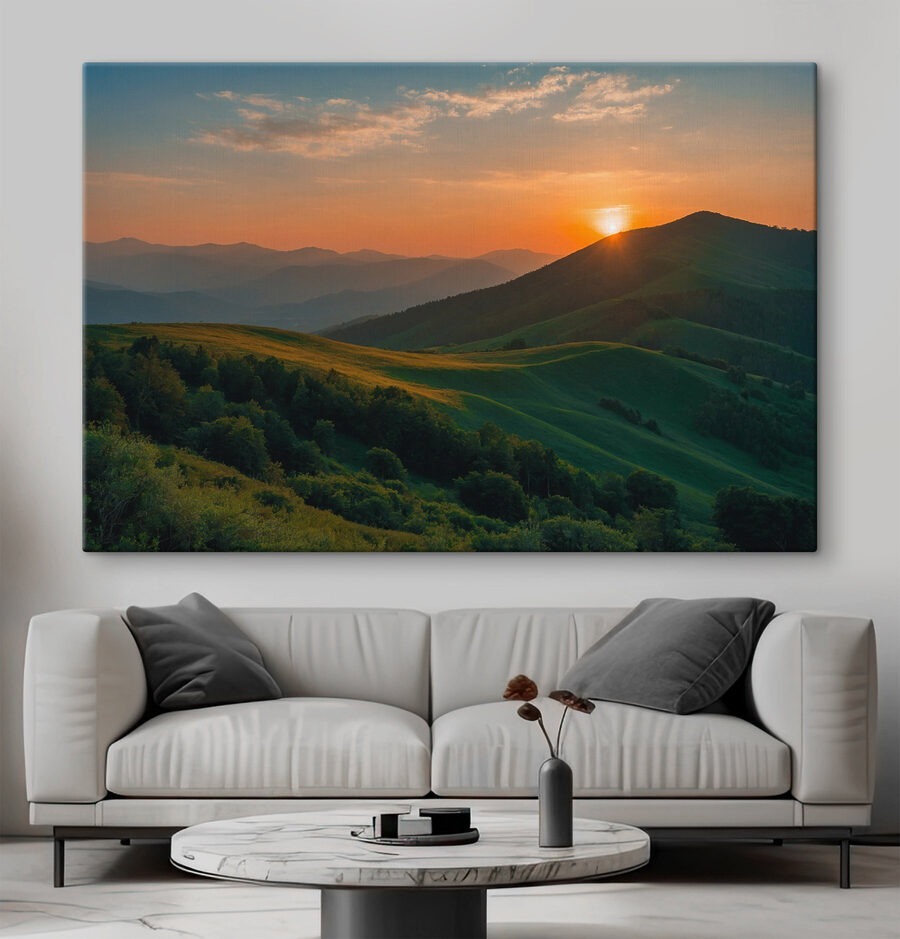 Wyobraź sobie, że patrzysz na to płótno każdego dnia – to jak Twoja osobista ucieczka bez wychodzenia z domu. Ten wydruk “Sunset over a Green Hill” to nie tylko sztuka; to natychmiastowy poprawiacz nastroju. Mieszanka ciepłych pomarańczy i uspokajającej zieleni przywodzi na myśl leniwe letnie wieczory, podczas których czas po prostu zwalnia. Idealny do każdego pomieszczenia, które potrzebuje odrobiny magii natury. Zawieś go w miejscu, w którym pijesz poranną kawę lub relaksujesz się po długim dniu. Z pewnością wywoła uśmiech lub dwa, a może nawet marzenia na jawie.