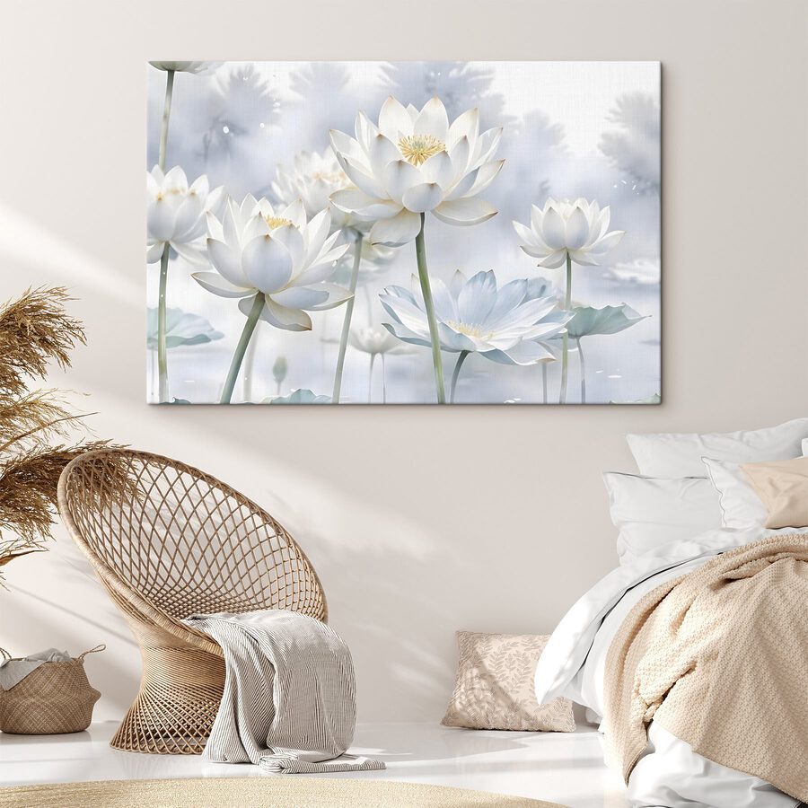 Wyobraź sobie, że wchodzisz do pokoju i jesteś witany przez spokojną grupę białych kwiatów, z których każdy maluje delikatną opowieść o elegancji natury. To płótno doskonale oddaje to uczucie – niczym delikatny szept w zabieganym dniu. Efekt akwareli dodaje odrobinę marzycielskości, jak te małe marzenia, które masz w leniwe popołudnie. Obraz aż prosi się o miejsce, w którym każdy będzie mógł podziwiać jego spokojną atmosferę. Ktoś może nawet powiedzieć, że skradnie show na następnym przyjęciu!